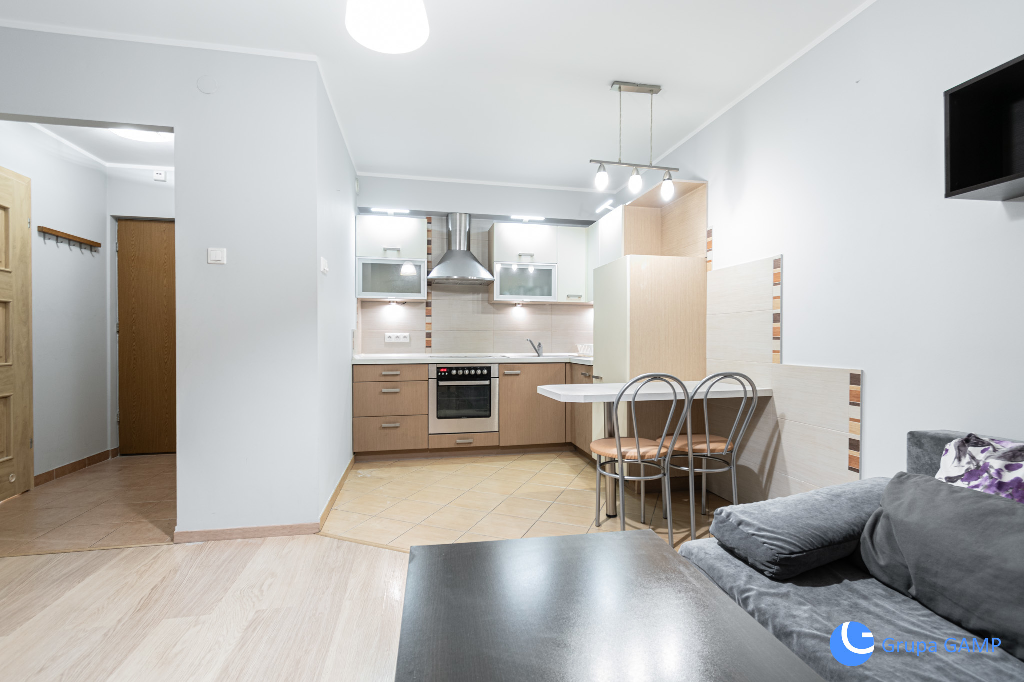 Nieruchomość z salonem i aneksem kuchennym ( wyposażony o komodę, rozkładaną sofę, stół z 2 krzesłami, meble w zabudowie kuchennej , piekarnik, płytę elektryczną, lodówkę), przedpokojem ( zabudowana szafa), sypialnią ( łóżko z materacem 140x200cm, szafa, stolik), łazienką ( prysznic, toaleta, pralka) oraz przestronnym balkonem z widokiem na Plac Bohaterów Getta.