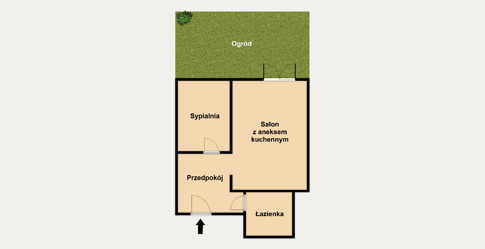 Rozkład pomieszczeń: pokój dzienny z wyjściem na ogród oraz aneksem kuchennym + oddzielna sypialnia + łazienka + przedpokój