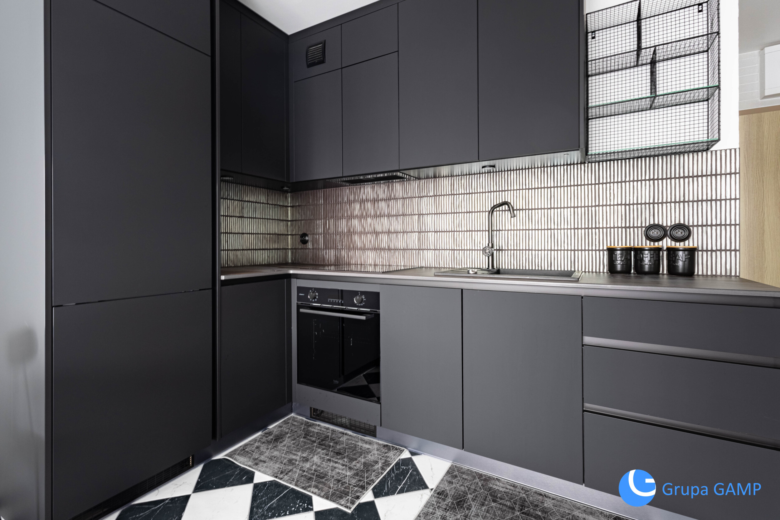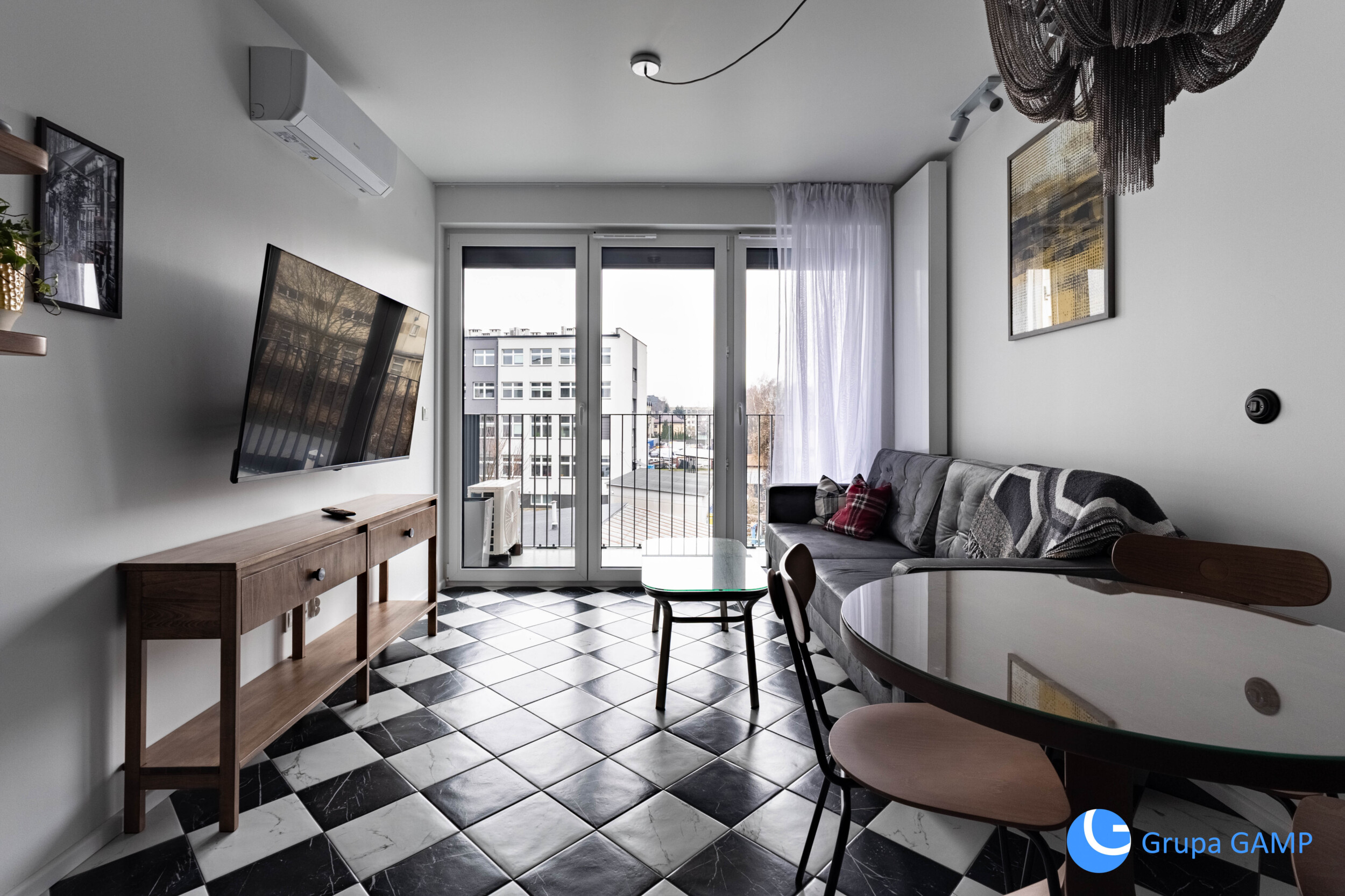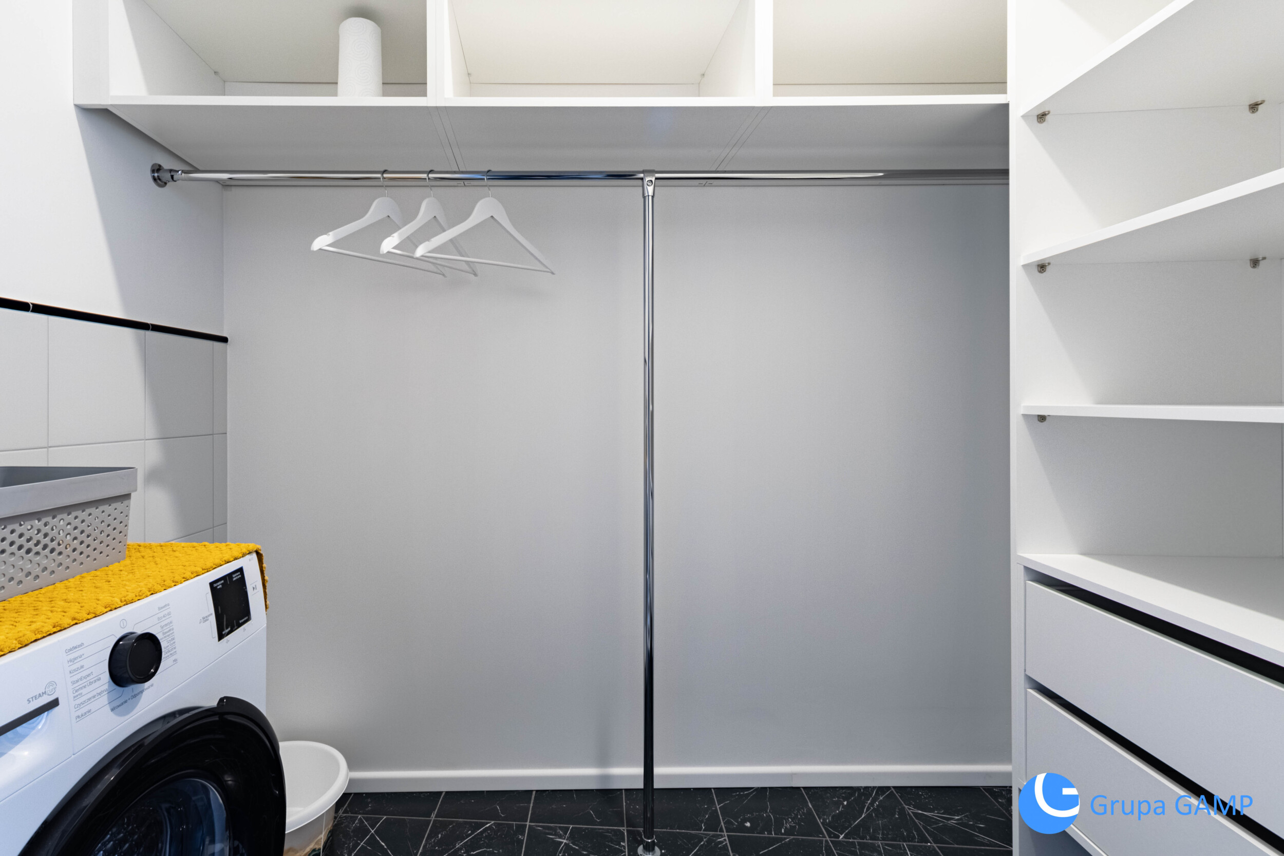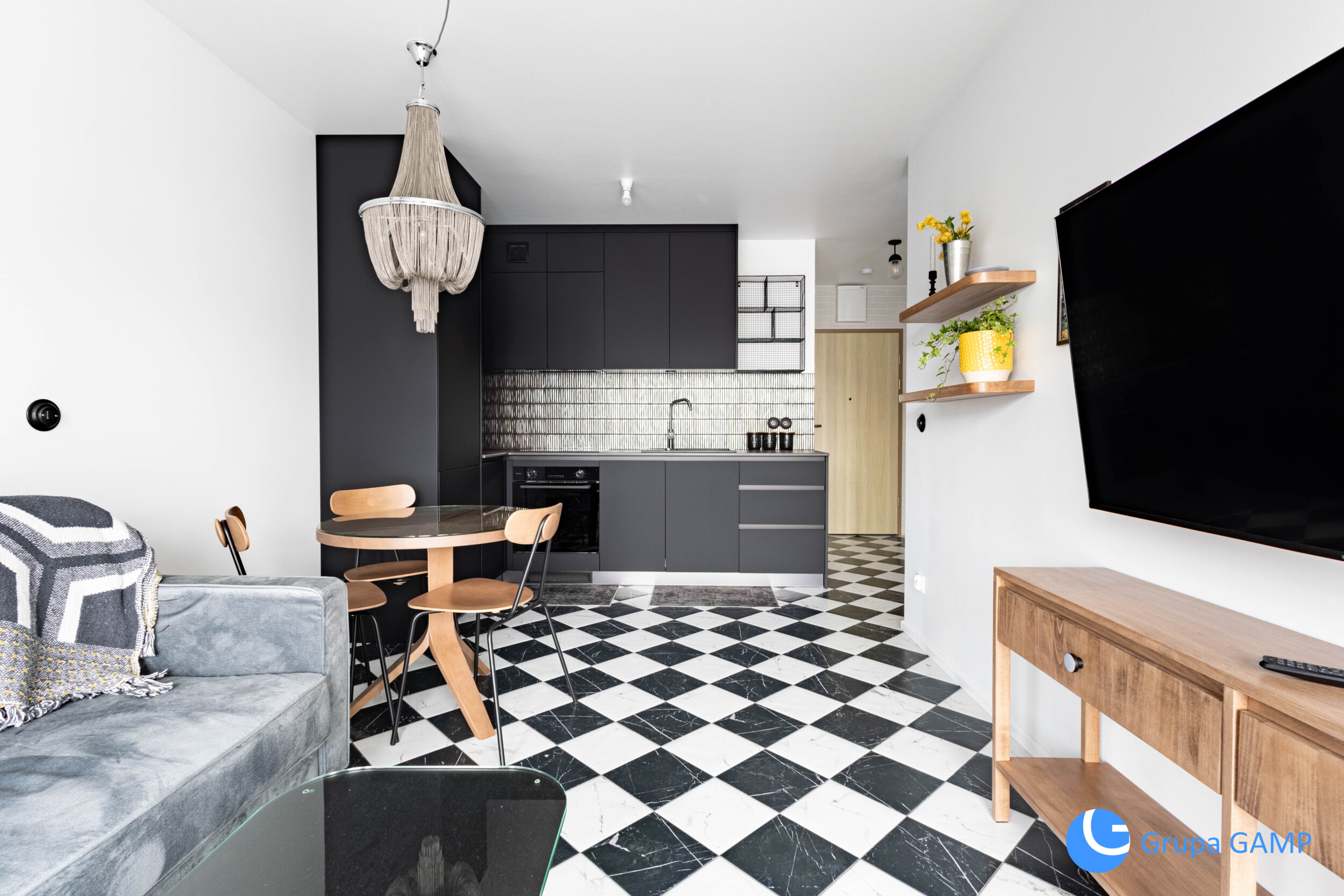 Pomieszczenia: salon z wyjściem na balkon (szafka RTV, stoliki kawowe, sofa, TV, stół z krzesłami) + aneks kuchenny (zmywarka, płyta indukcyjna, okap, piekarnik, lodówka) + łazienka (prysznic) + sypialnia (duże łóżko, szafa, biurko, krzesło, TV) + garderoba (pralka);