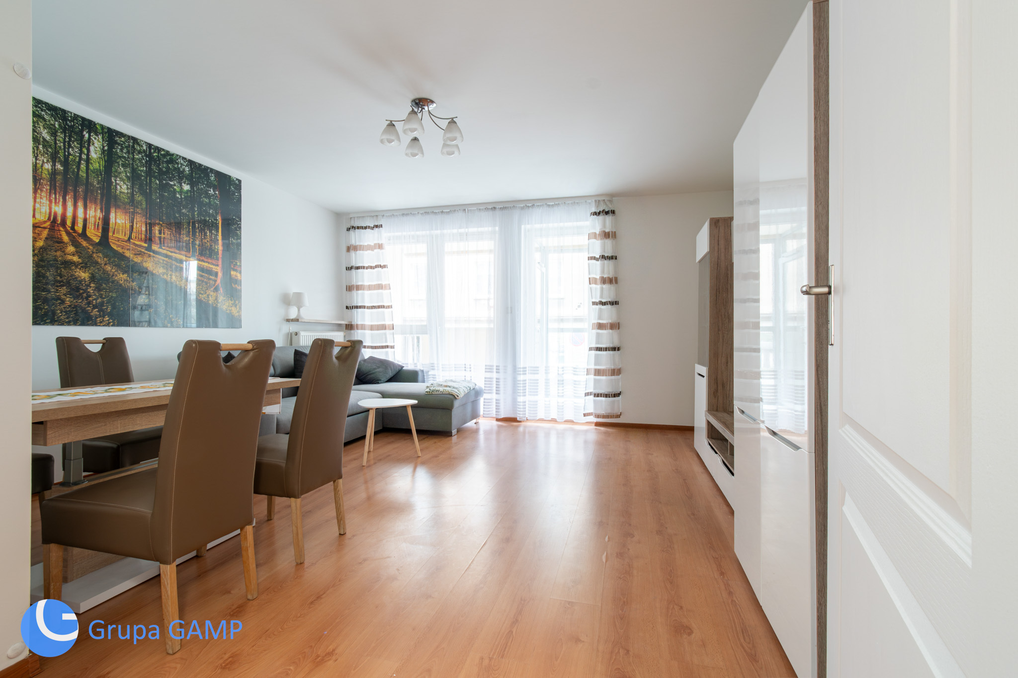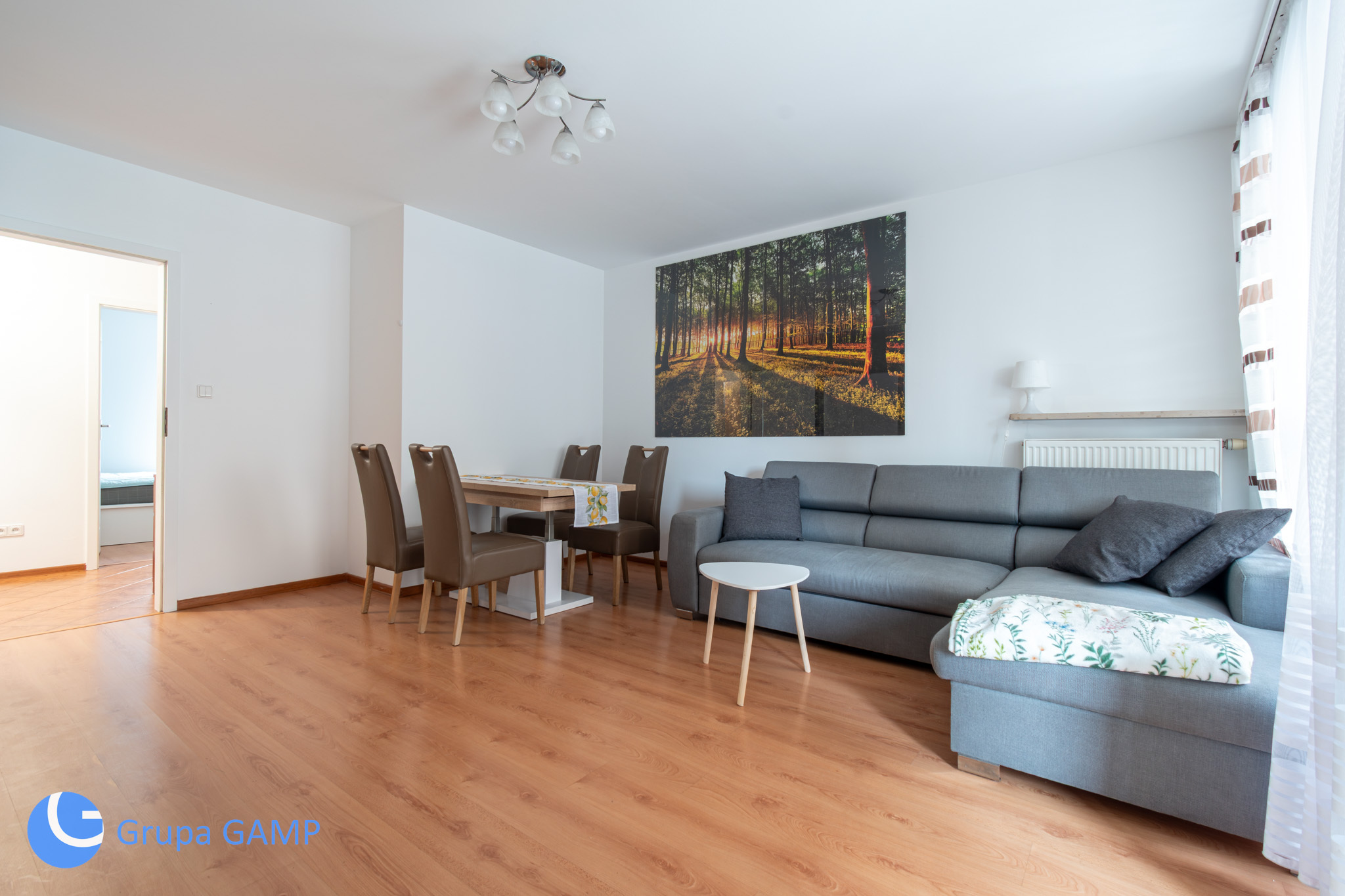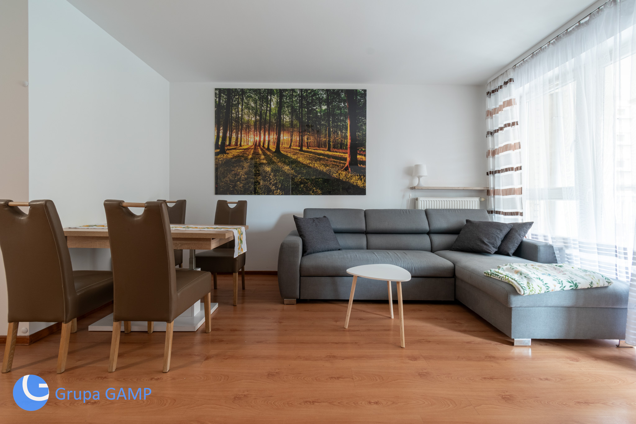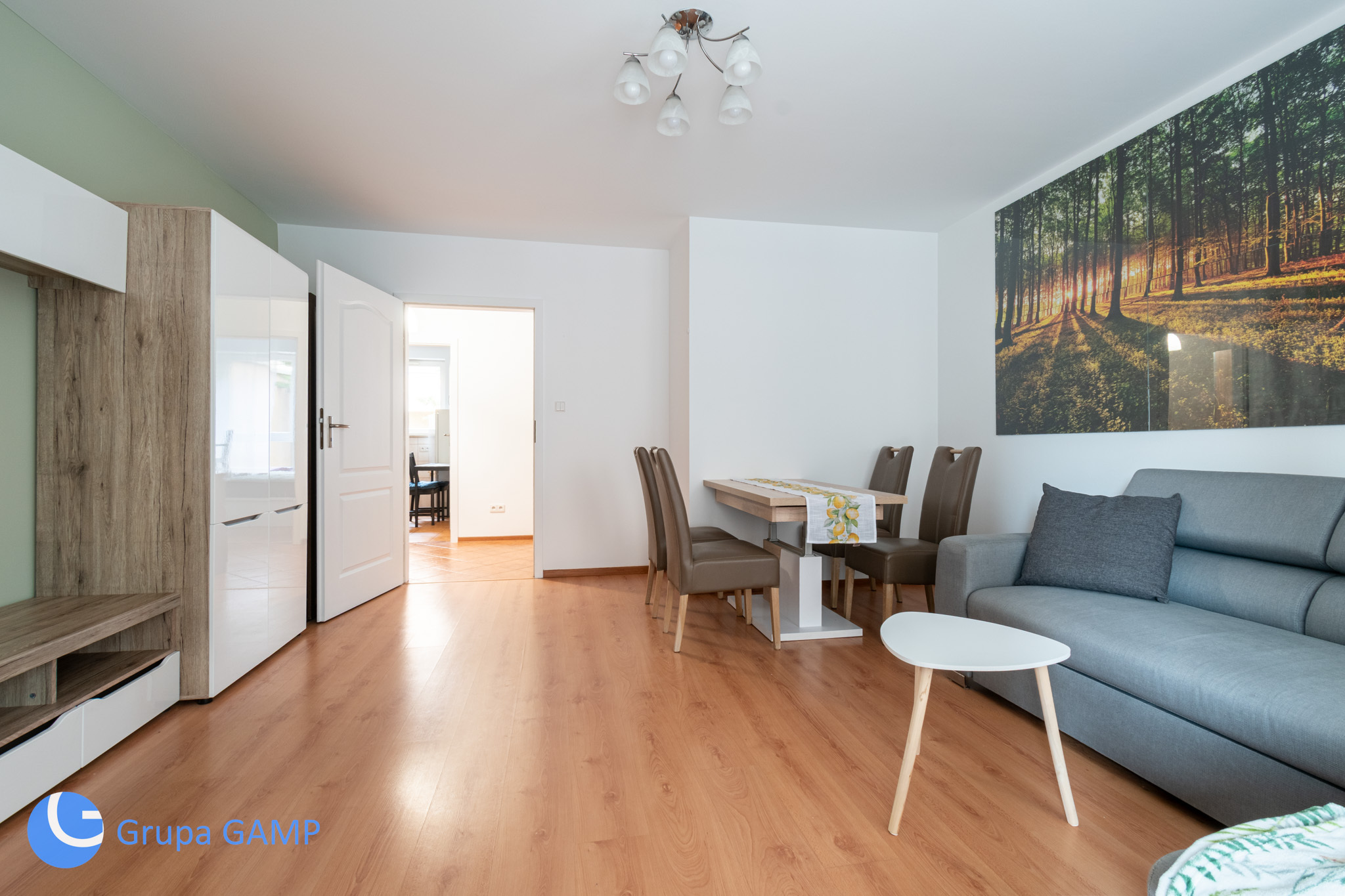 Mieszkanie znajduje się na pierwszym piętrze. Lokal jest w pełni wyposażony i umeblowany. W jego skład wchodzą: