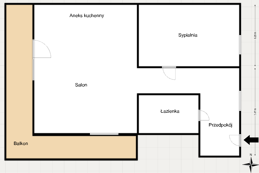 Rozkład pomieszczeń: salon z aneksem + sypialnia + łazienka (prysznic) +przedpokój + duży balkon,