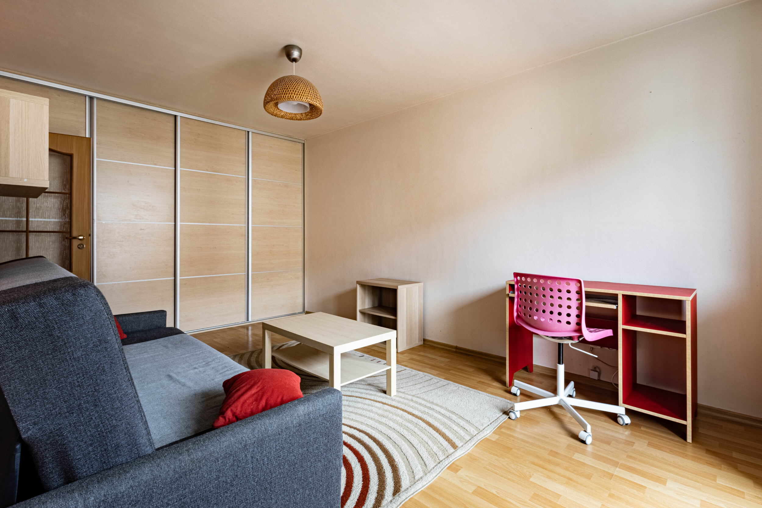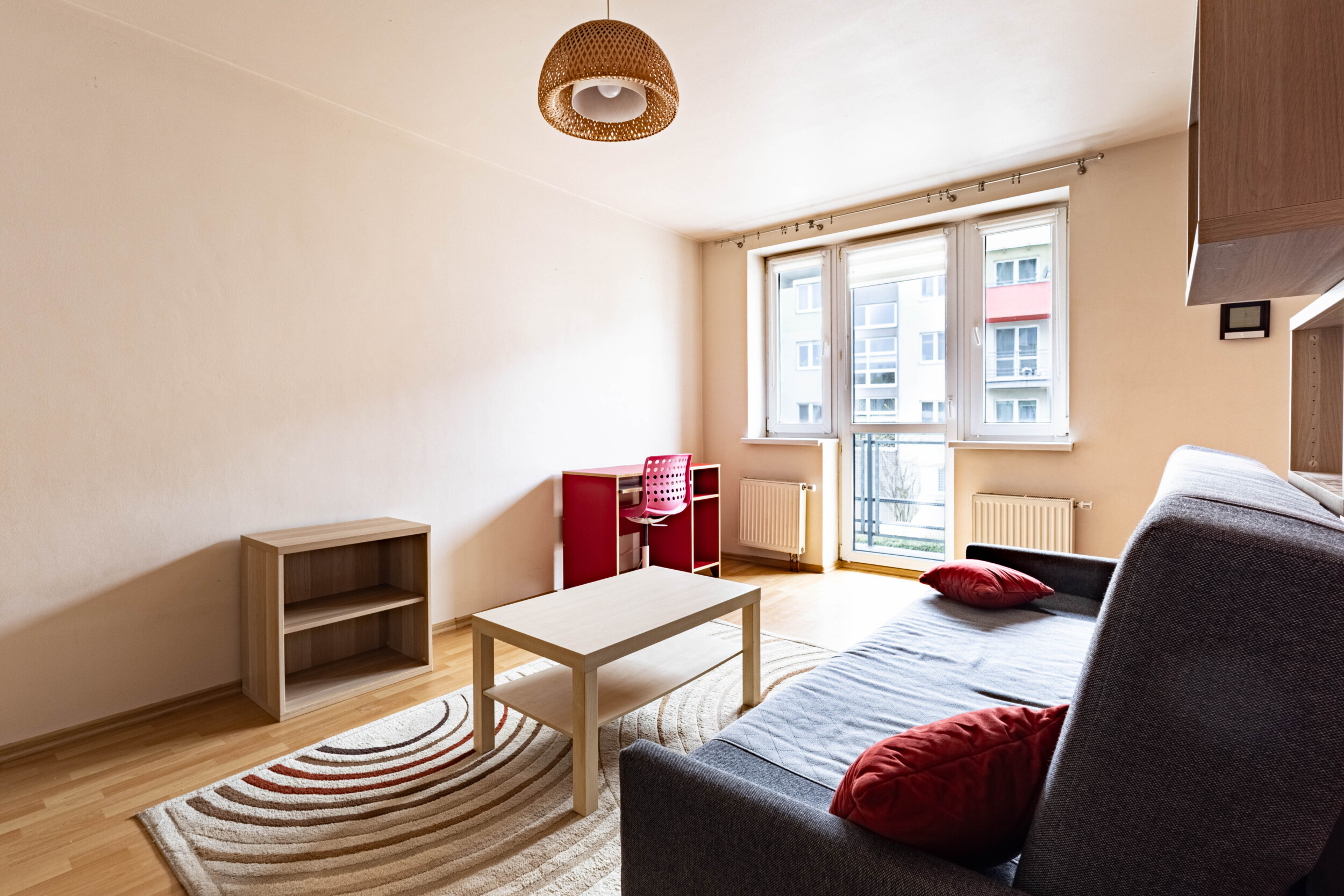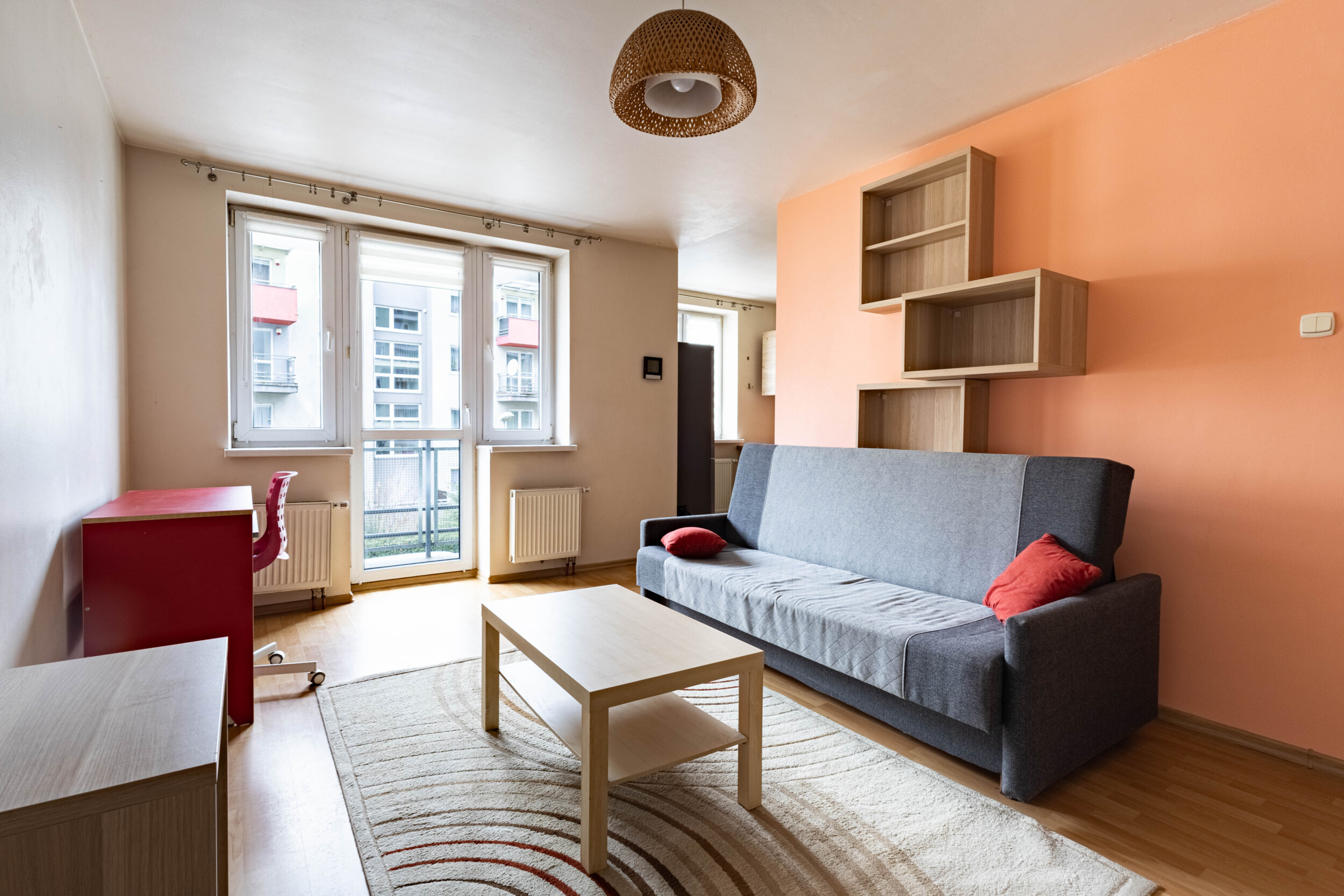 Pomieszczenia: salon z aneksem kuchennym (wyjście na balkon, rozkładana kanapa, szafa, biurko z krzesłem, lodówka, zmywarka, piekarnik, płyta gazowa, okap) + sypialnia (rozkładana kanapa, dwie komody) + przedpokój (zabudowana szafa) + łazienka (wanna z funkacją prysznica, pralka).