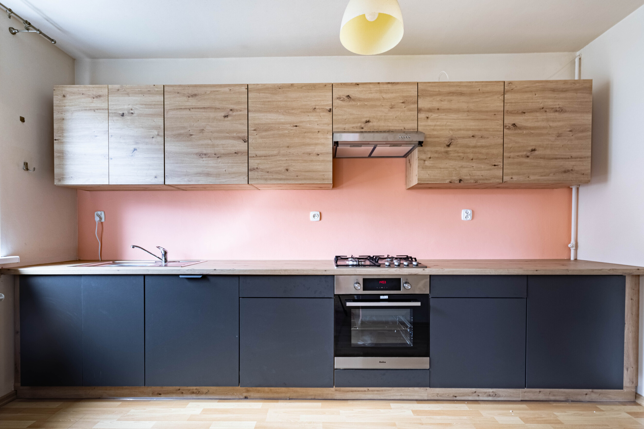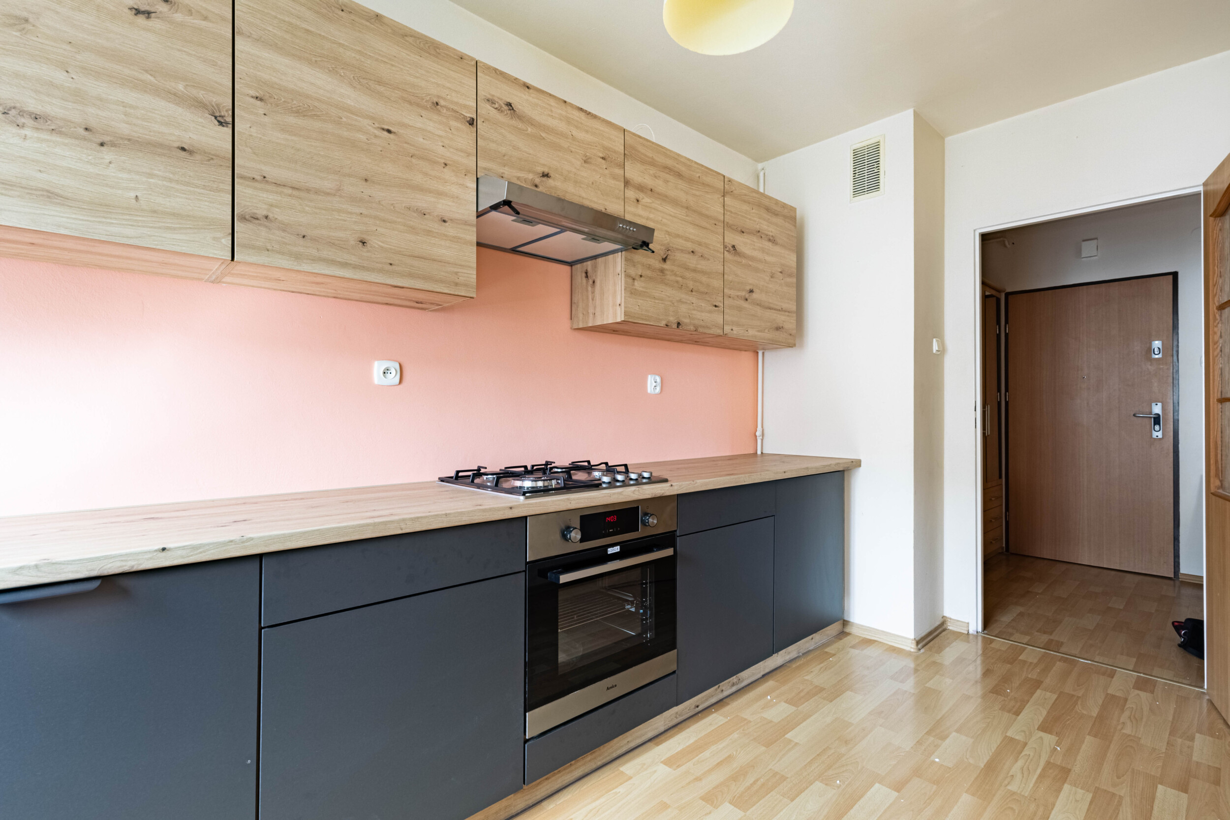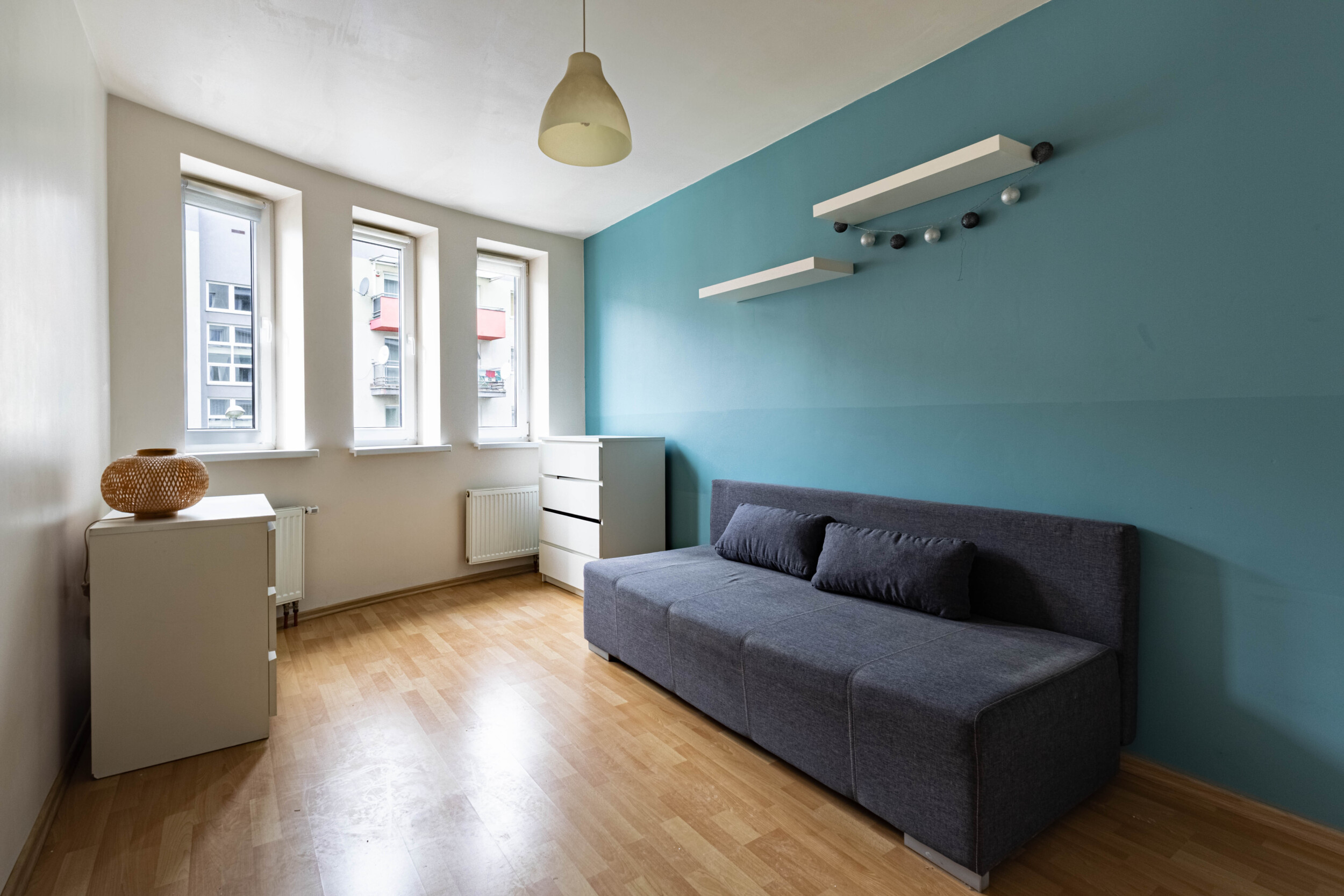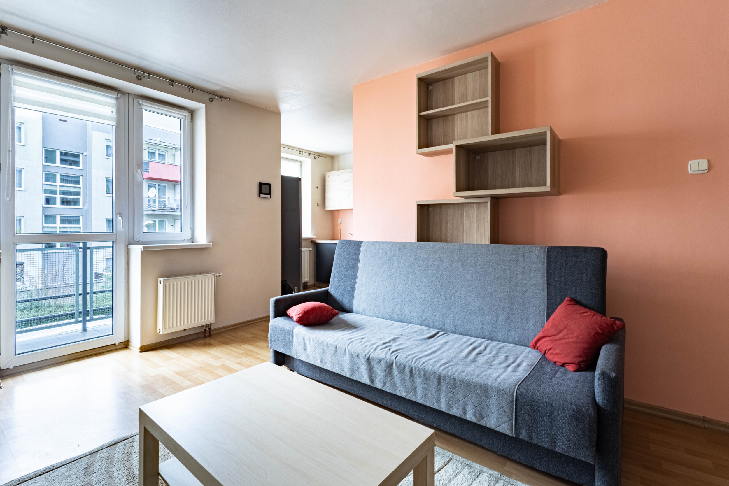 Pomieszczenia: salon z aneksem kuchennym (wyjście na balkon, rozkładana kanapa, szafa, biurko z krzesłem, lodówka, zmywarka, piekarnik, płyta gazowa, okap) + sypialnia (rozkładana kanapa, dwie komody) + przedpokój (zabudowana szafa) + łazienka (wanna z funkacją prysznica, pralka).