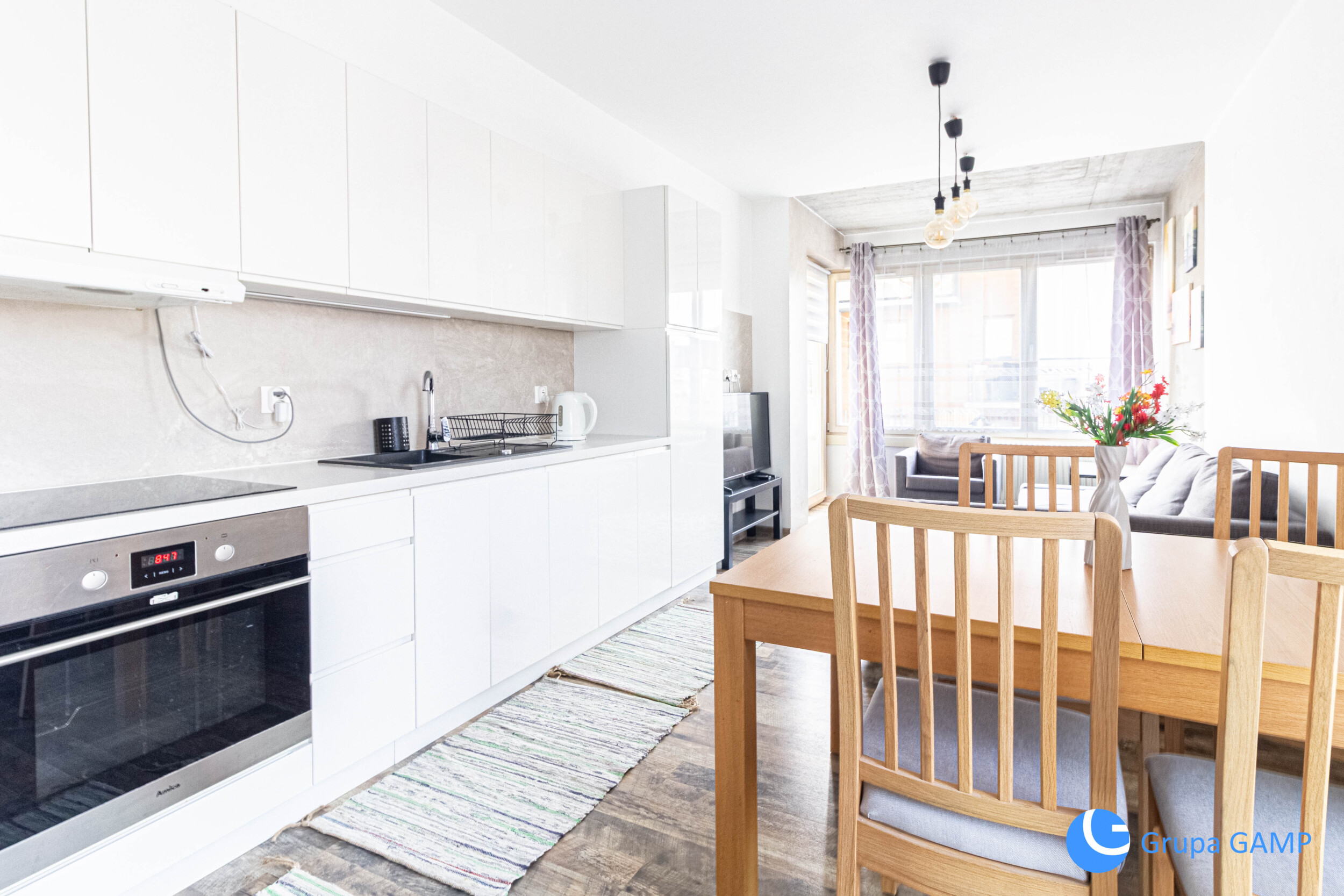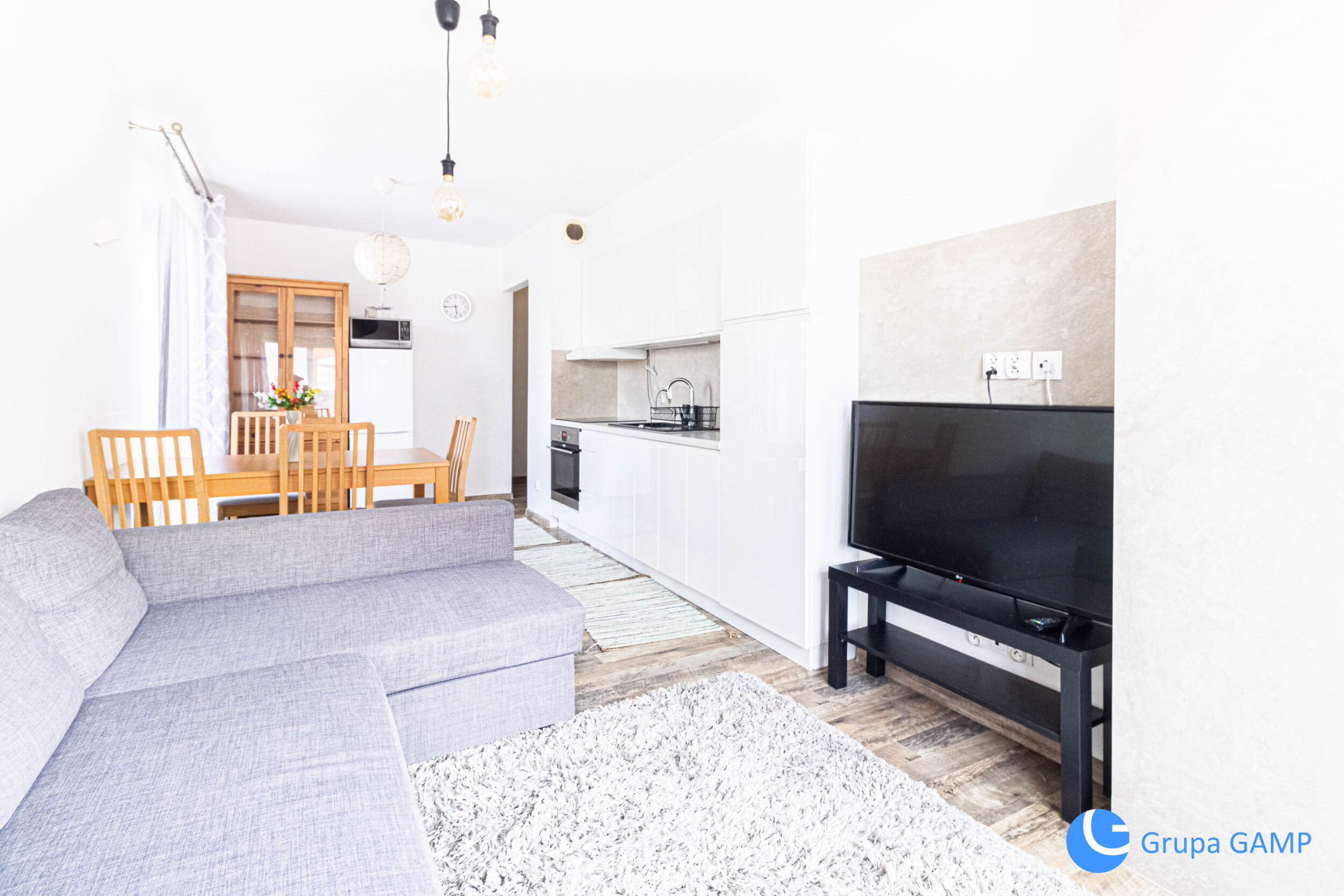 Salon z aneksem kuchennym wyposażony o kanapa rozkładana, szafka pod telewizor, stół z 4 krzesłami, meble w zabudowie kuchennej, zmywarka, zlew, piekarnik, płyta indukcyjna, lodówka, zamrażalka) + I pokój ( szafa, komoda, fotel) + II pokój ( łóżko dwuosobowe, 2 szafki nocne, komoda ) + łazienka (wanna, umywalka, toaleta, pralka) + przedpokój(szafa) + balkon( stół z 2 krzesłami)