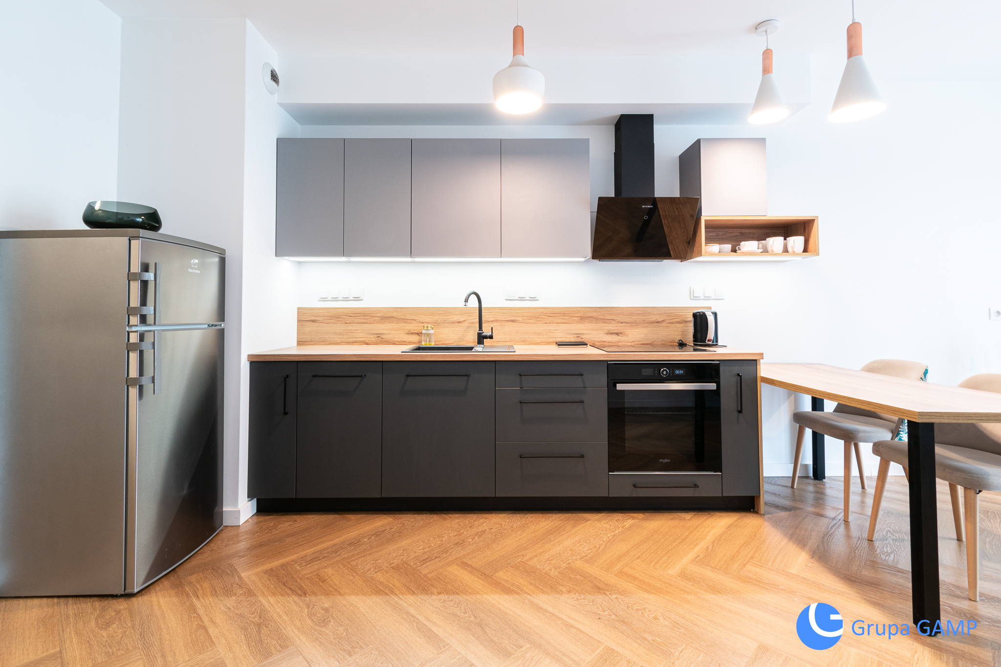 – aneks kuchennym w którym znajdują się: meble w zabudowie kuchennej, zmywarka, piekarnik, indukcyjna płyta grzewcza, okap, lodówko-zamrażarka, zlewozmywak,