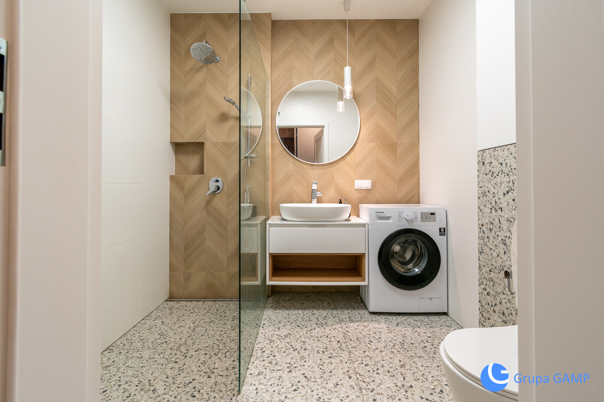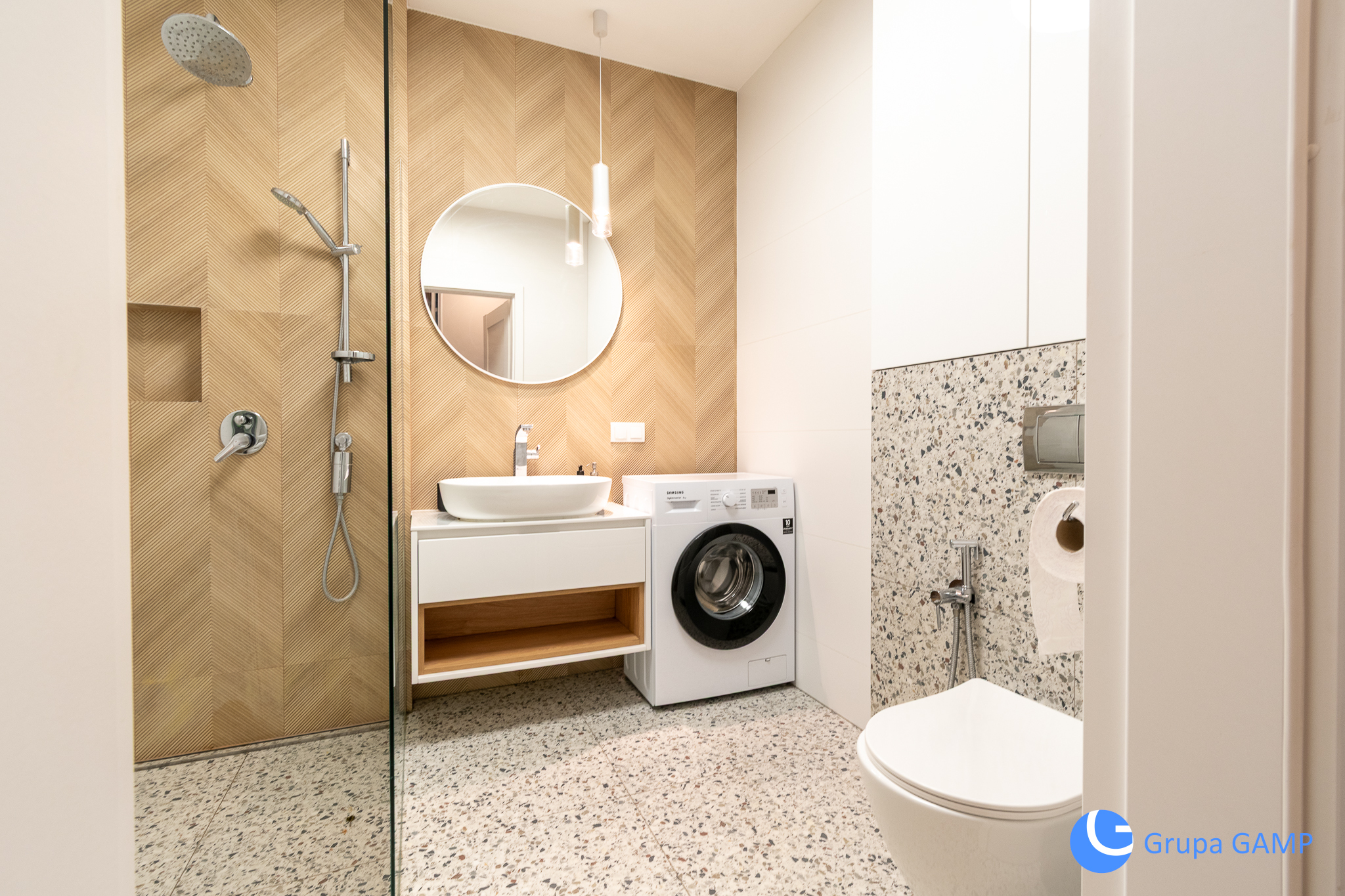 – łazienka z: kabina prysznicową, toaletą, umywalką, pralką,