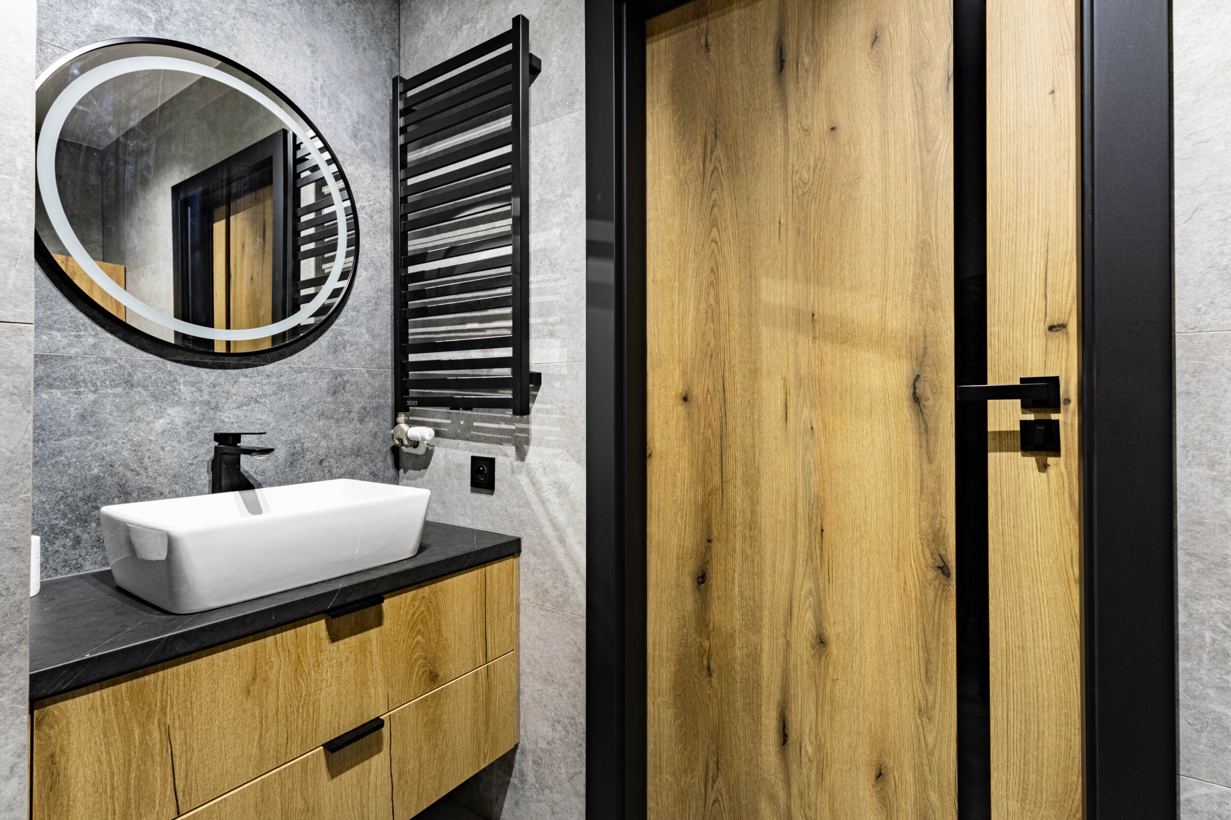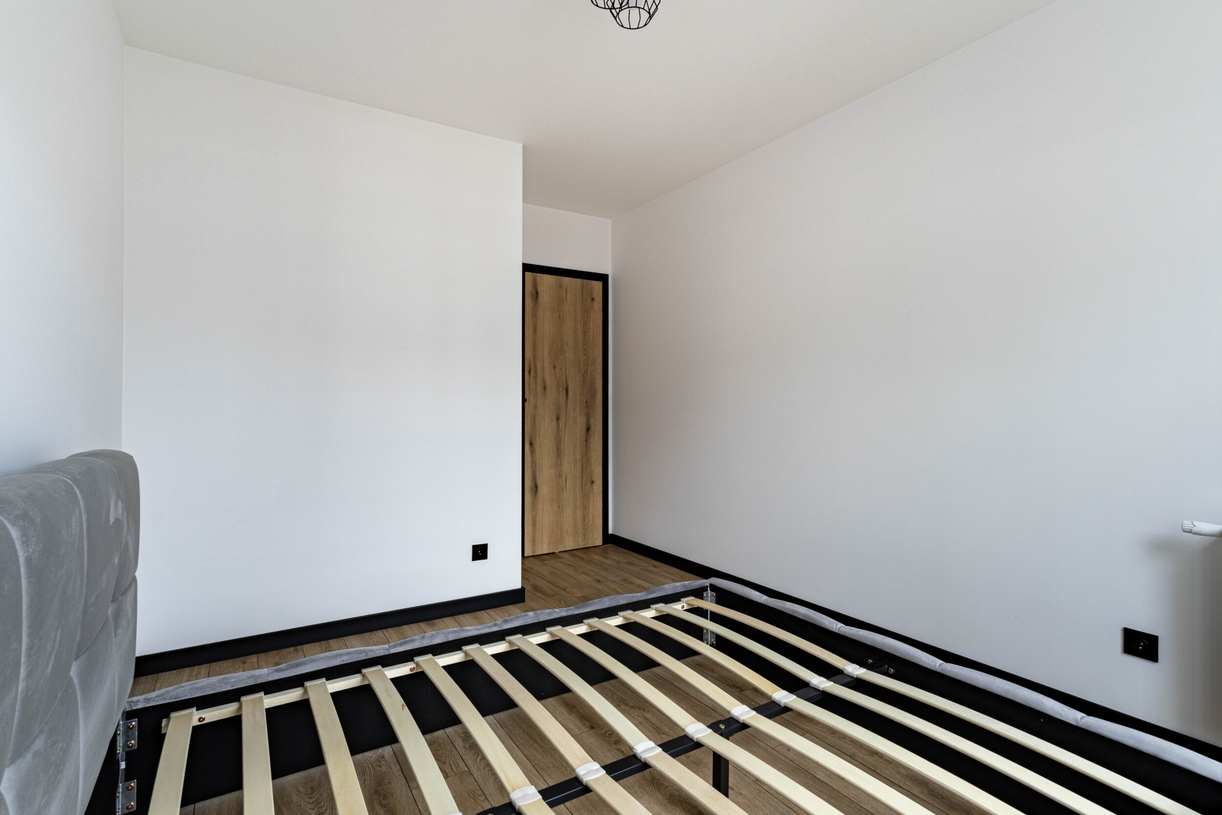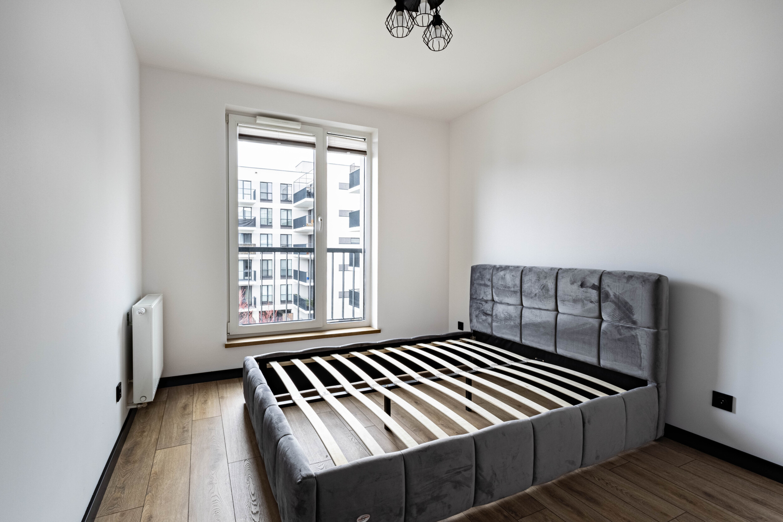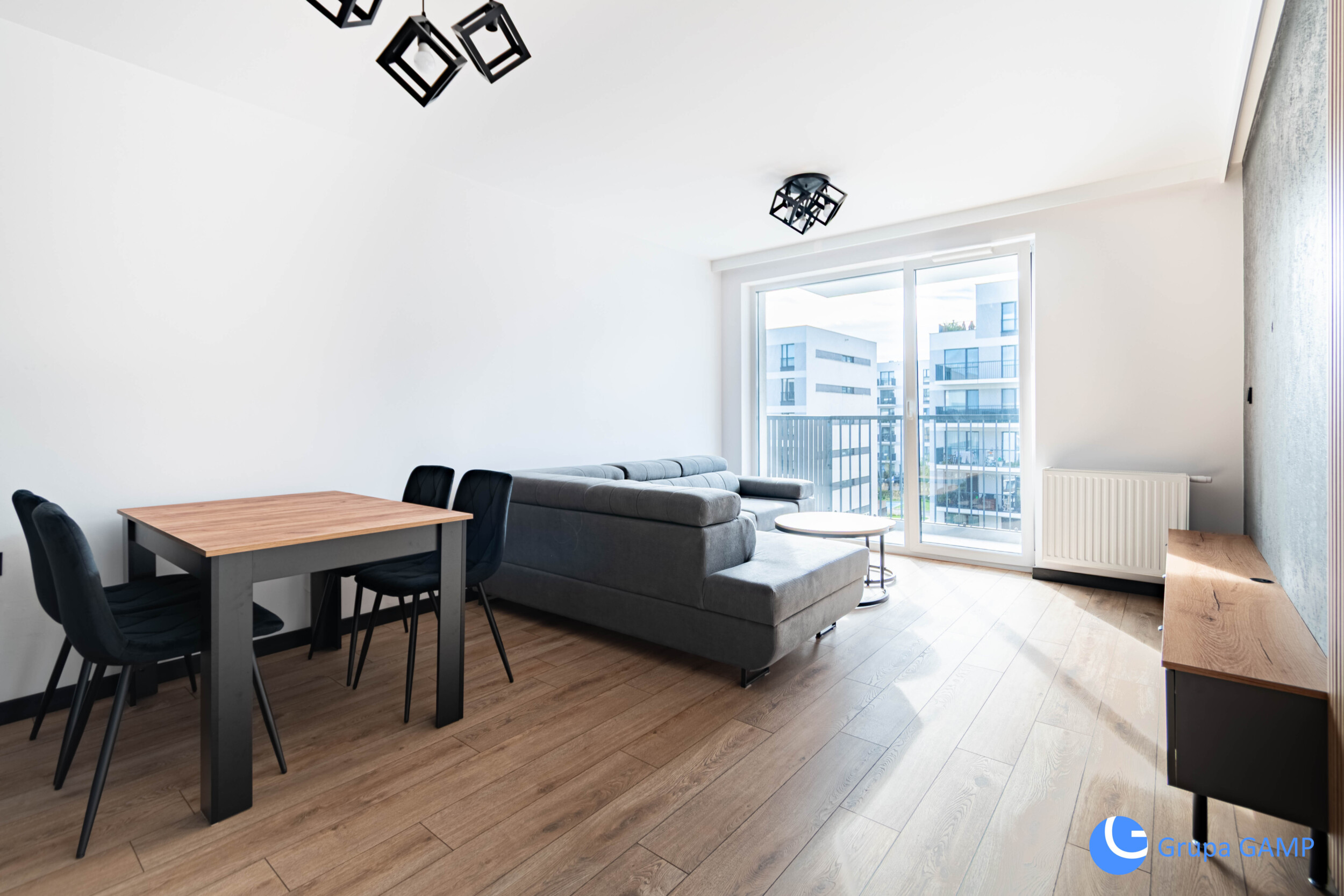 Rozkład: dwa niezależne pokoje: salon z balkonem (wyposażony w kanapę, stół z krzesłami, szafkę RTV oraz sporą szafę), sypialnia (łóżko dwuosobowe + szafa – nie widoczne na zdjęciach), osobna kuchnia (lodówka, piekarnik, mikrofala, płyta indukcyjna, okap, zmywarka, liczne szafki), łazienka (prysznic, pralka, lustro – niewidoczne na zdjęciach), przedpokój (duża szafa).