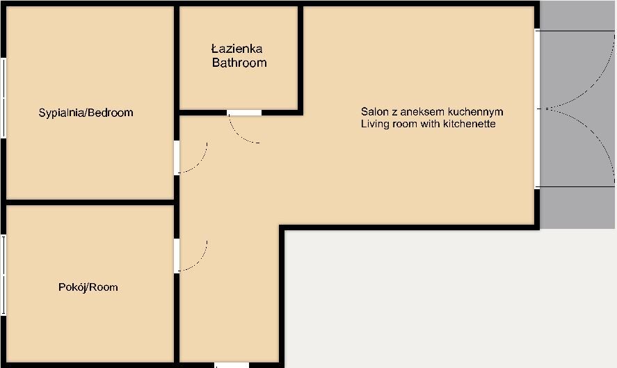 Rozkład pomieszczeń: salon z aneksem + pokój + sypialnia + łazienka (wanna) + przedpokój (widoczne na rzucie)