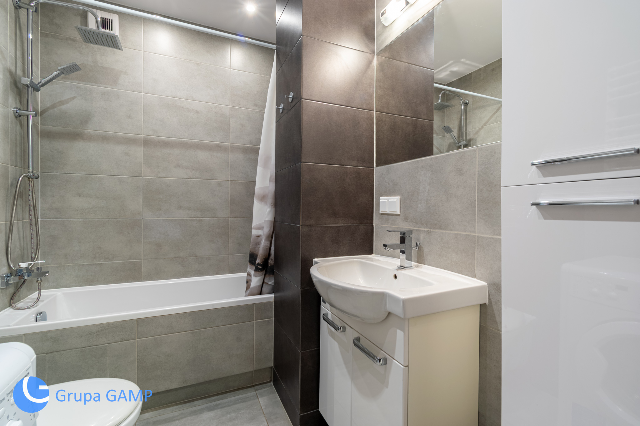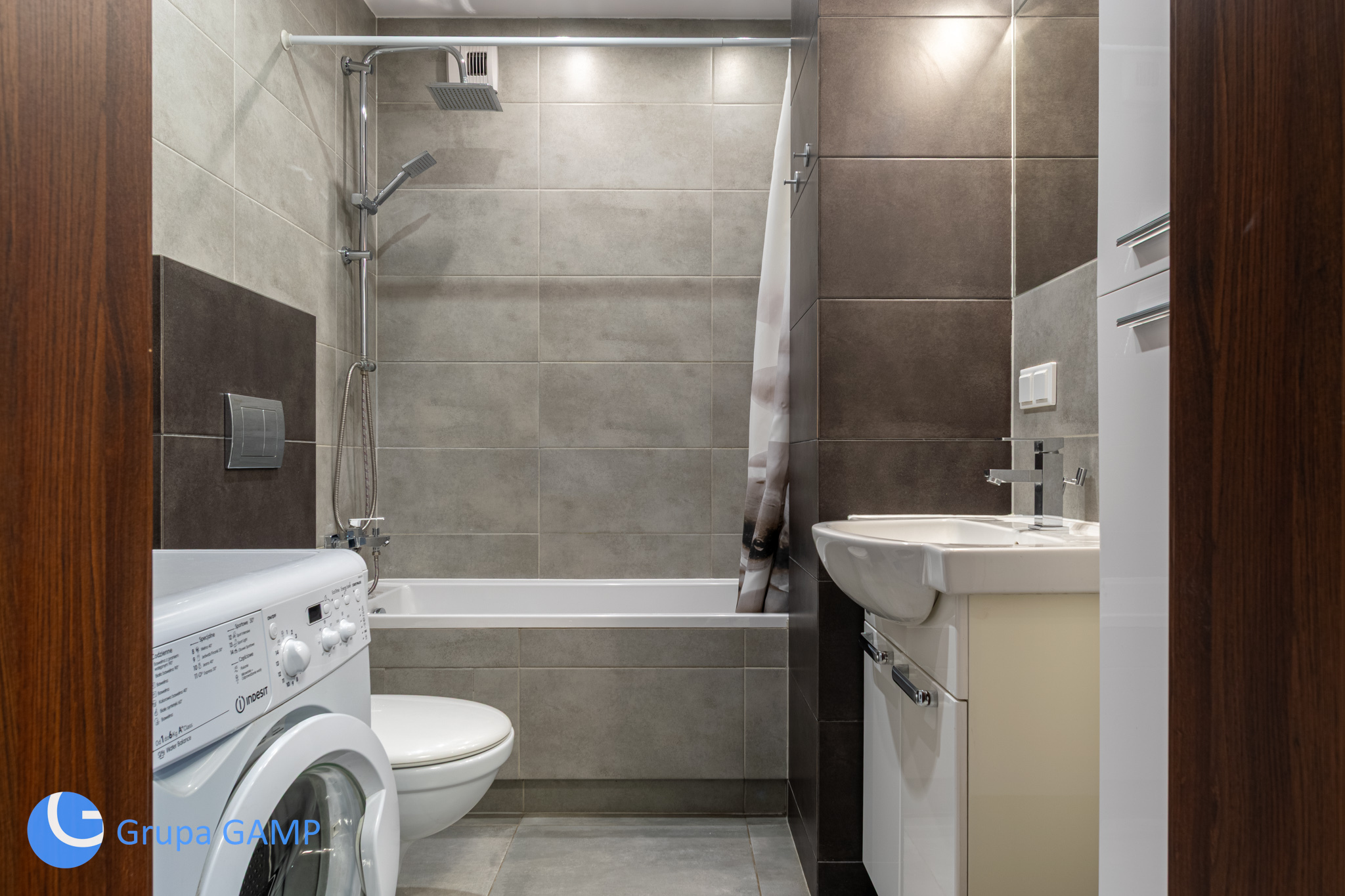 - Łazienka: Wyposażona w wannę z prysznicem, pralkę, umywalkę, WC oraz szafki.