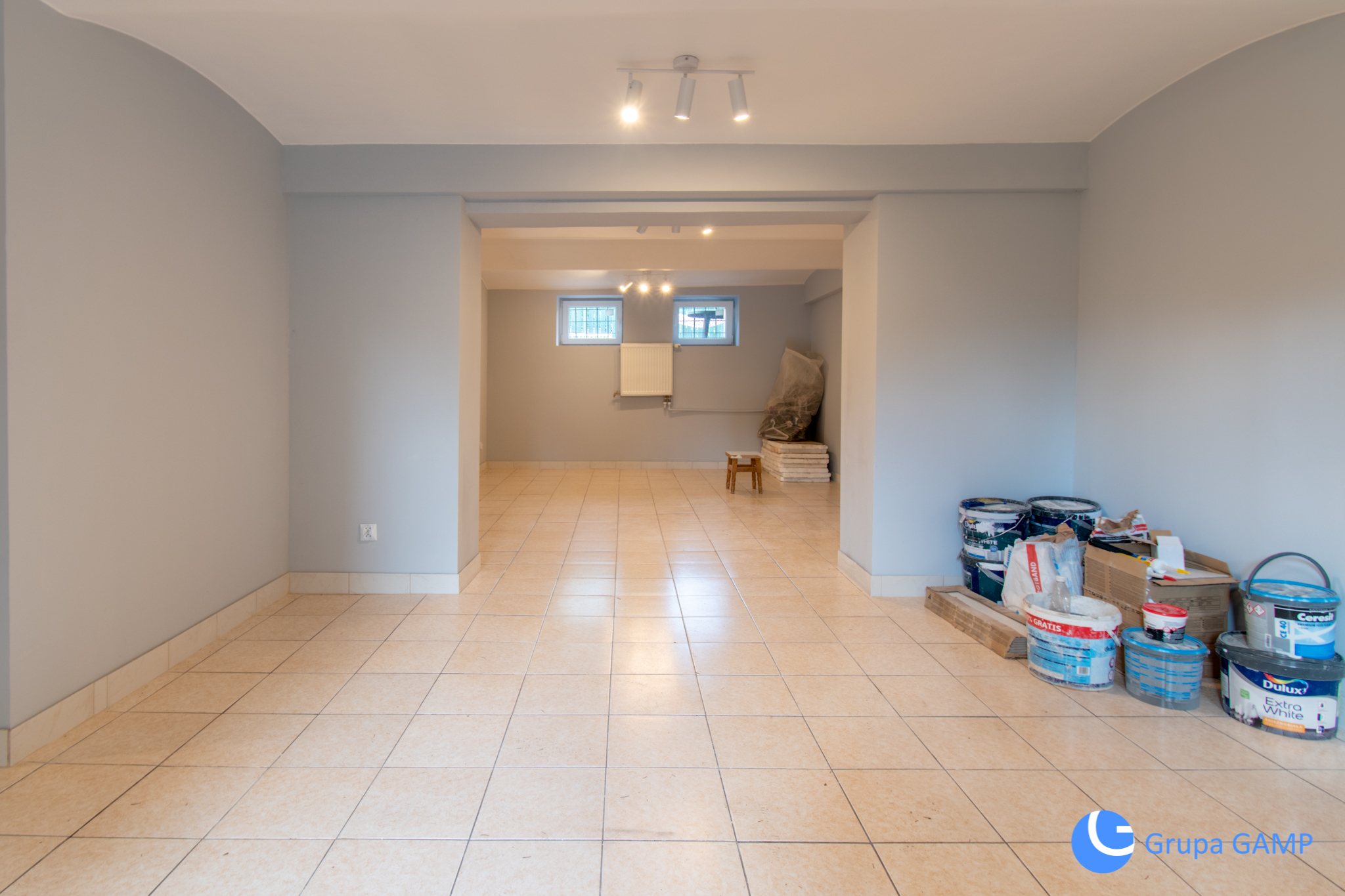 Rozkład pomieszczeń: trzy duże pomieszczenia, hall, kotłownia, WC, biuro (widoczne na rzucie)