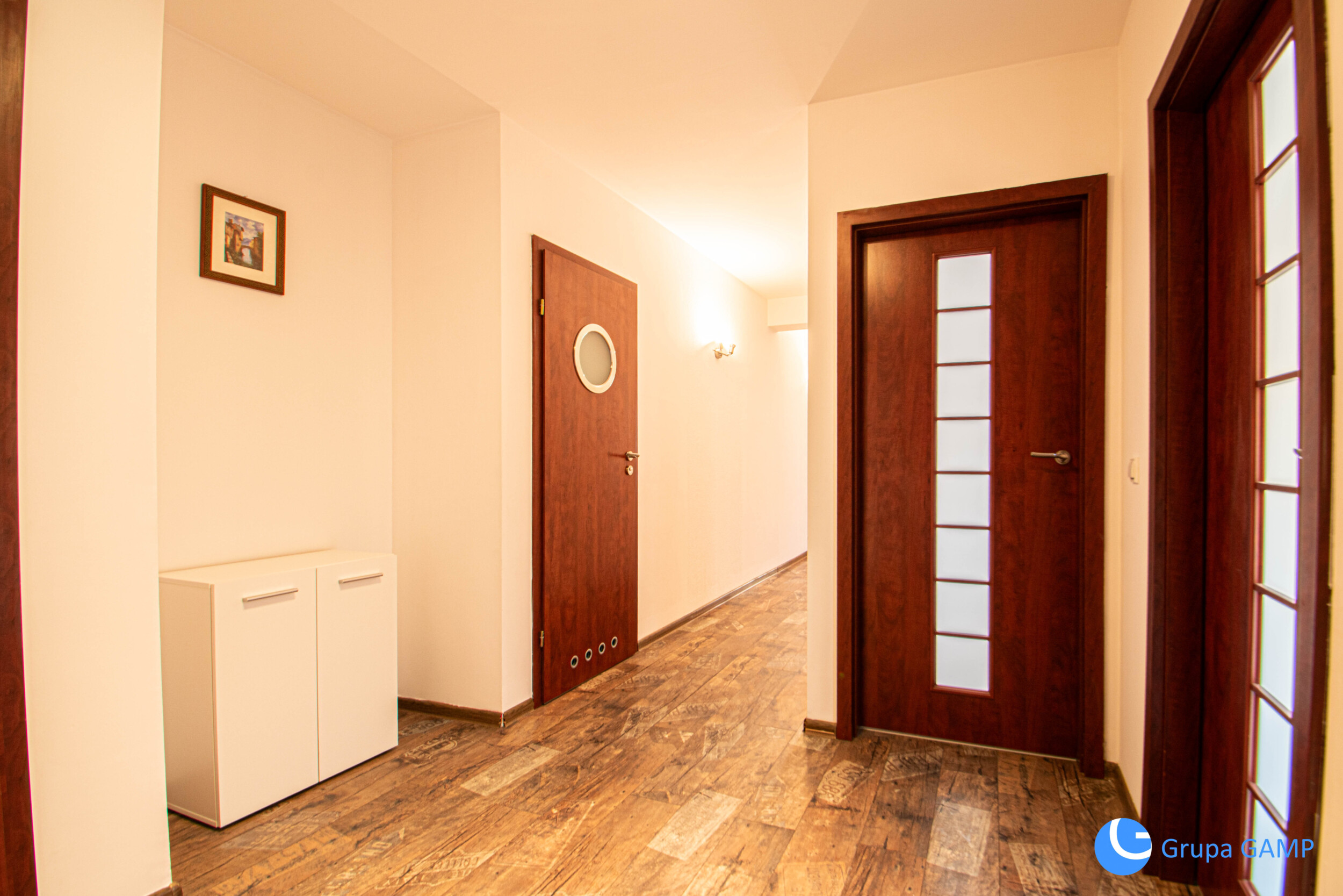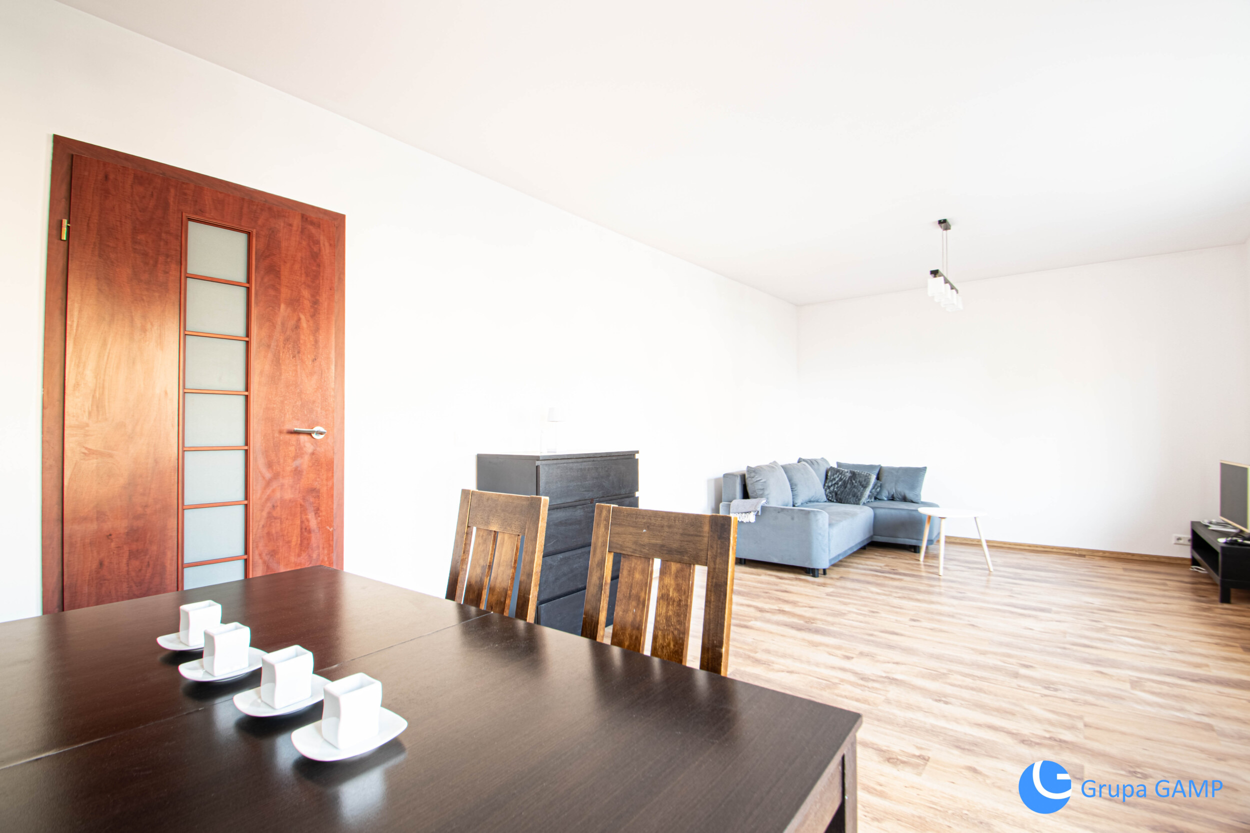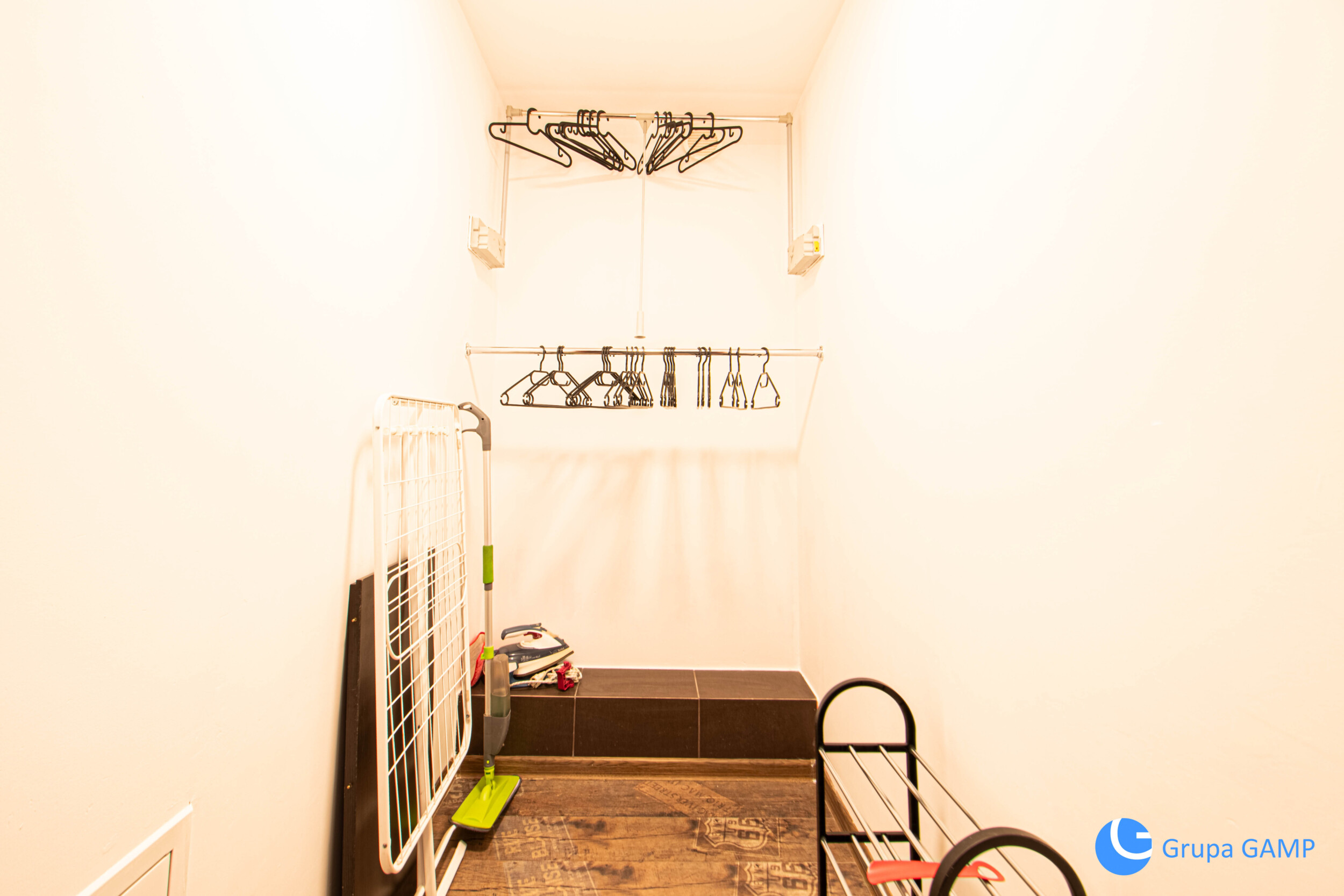 Rozkład pomieszczeń: I pokój ( wyposażony w duża sofę, komodę z telewizorem, stół z krzesłami) + II pokój ( wersalka, szafa) + III pokój ( wersalka, szafa) + łazienka (prysznic, umywalka, pralka oraz toaleta) + garderoba + przedpokój (szafa);