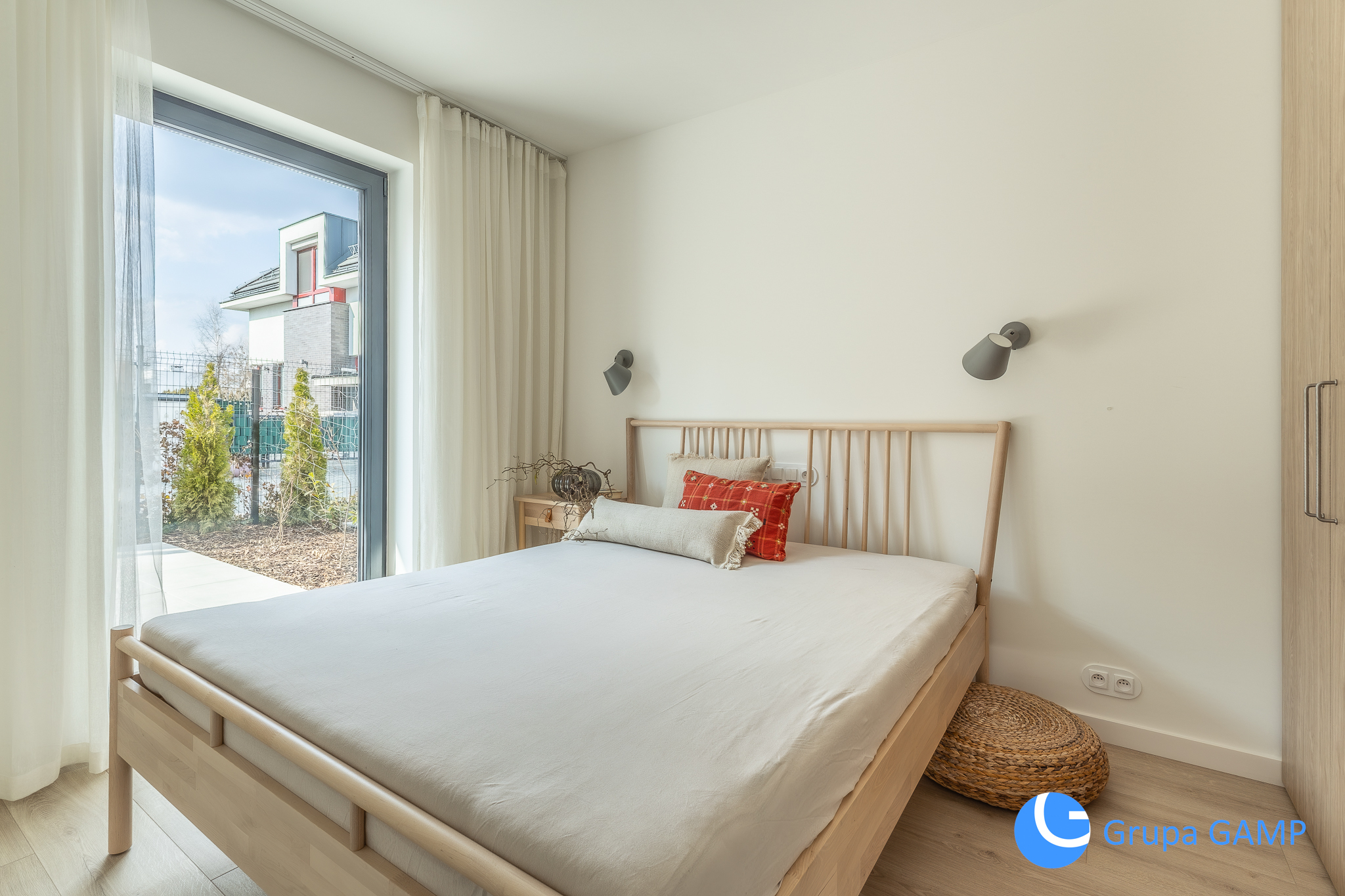 Rozkład pomieszczeń: salon z aneksem kuchennym z bezpośrednim dostępem do tarasu posiadającym ekspozycję na zachód + sypialnia (łóżko z materacem 160×200 cm, pojemna szafa w zabudowie) z dostępem do tarasu + łazienka (prysznic, umywalka, toaleta, szafa w zabudowie z pralką i kotłem gazowym) + wiatrołap (szafka na buty, pojemna szafa w zabudowie)