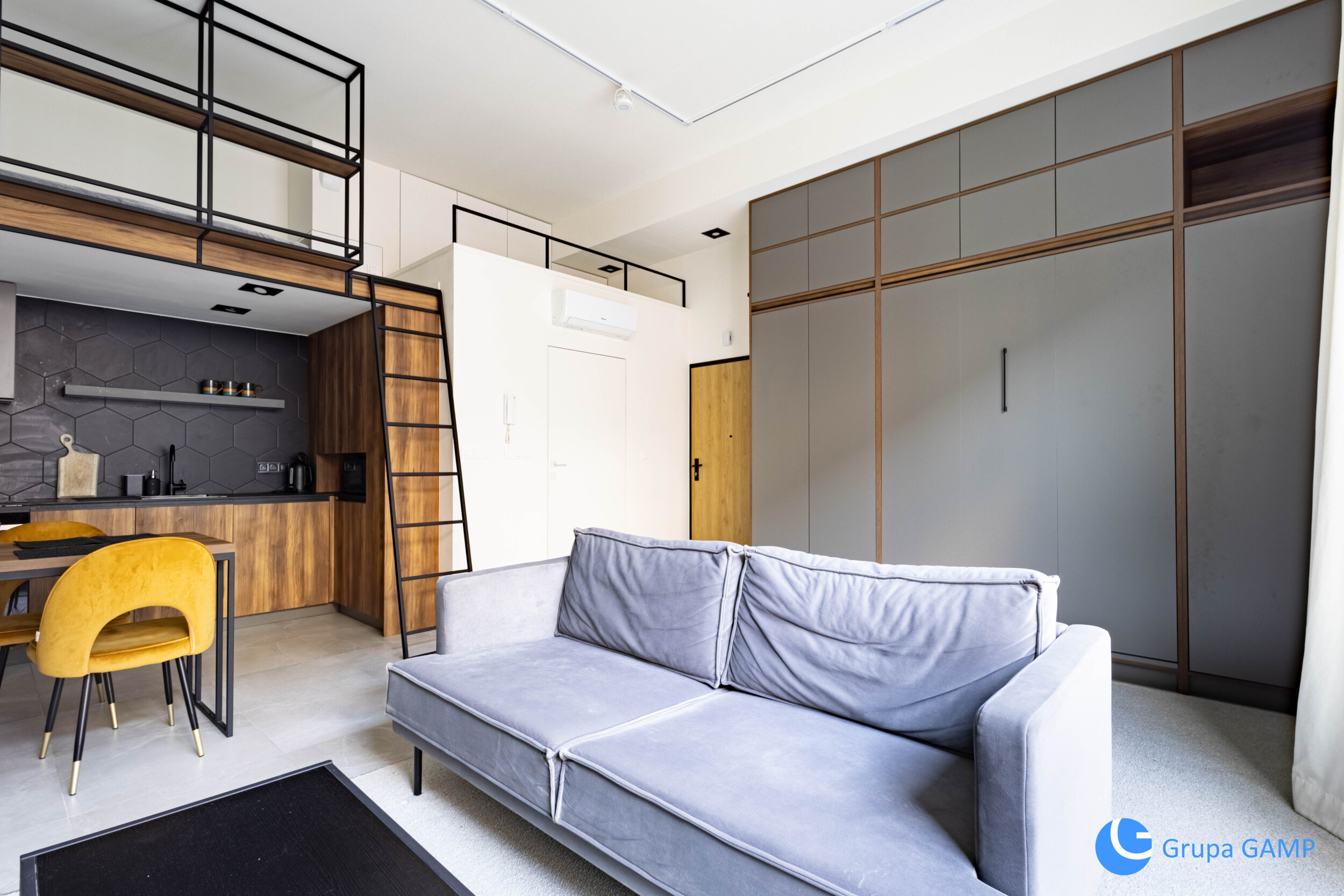 Rozkład: pokój z aneksem kuchennym (wyposażony w kanapę, stół z krzesłami, szafę w zabudowie (łóżko dwuosobowe), lodówka, zmywarka, piekarnik, płyta indukcyjna) + antresola (część sypialniana + szafki w zabudowie) + łazienka (prysznic, pralka)