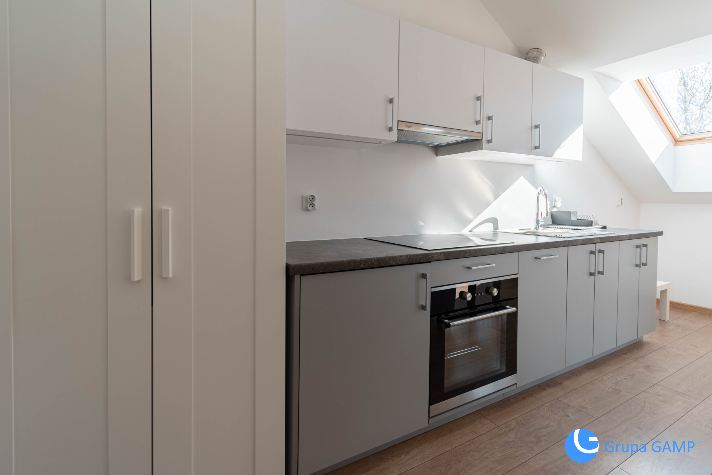 Rozkład pomieszczeń: pokój dzienny z aneksem kuchennym + wydzielona sypialnia + łazienka (prysznic) + przedpokój + balkon ok 3m2