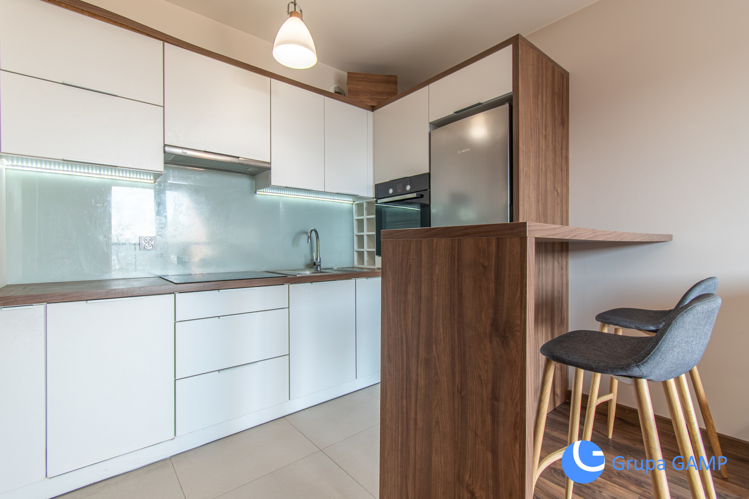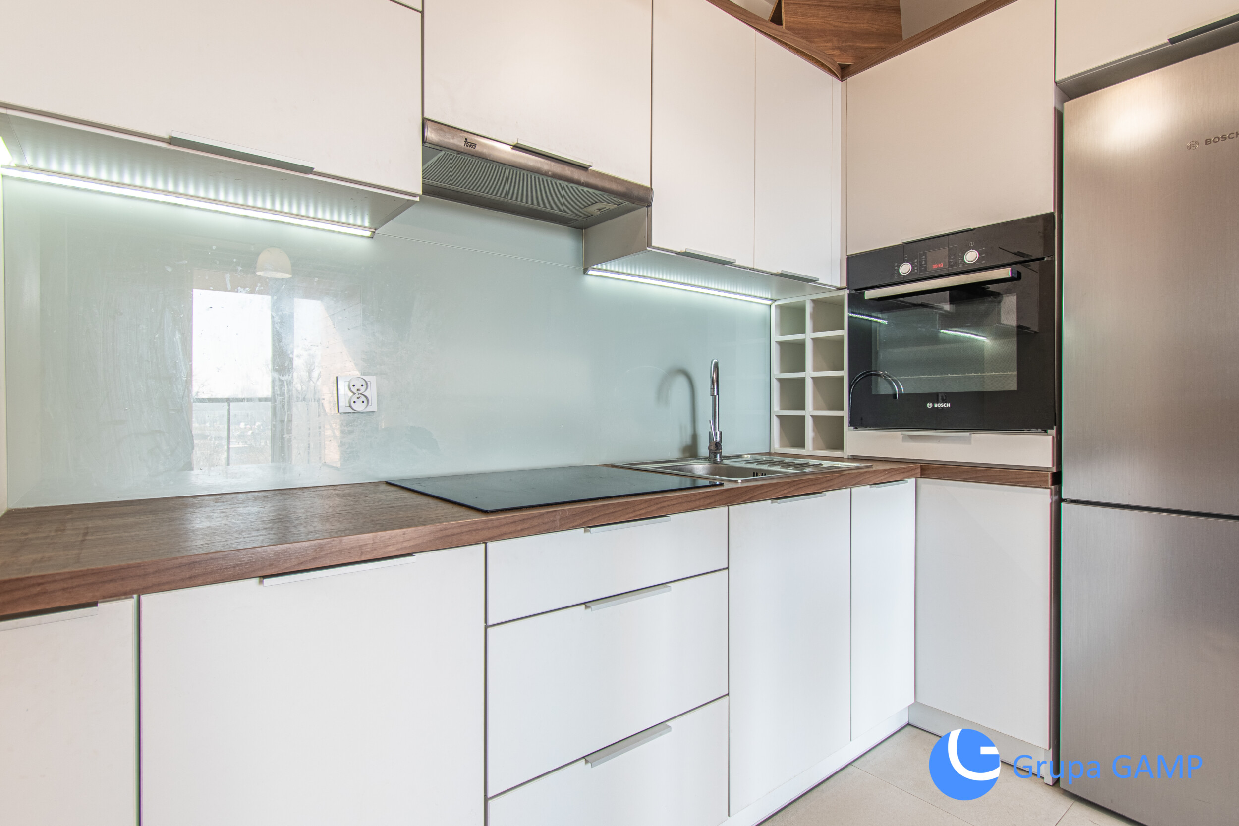 – aneks kuchenny: meble w zabudowie, zmywarka zlewozmywak, lodówko-zamrażalka, piekarnik, płyta grzewcza indukcyjna;