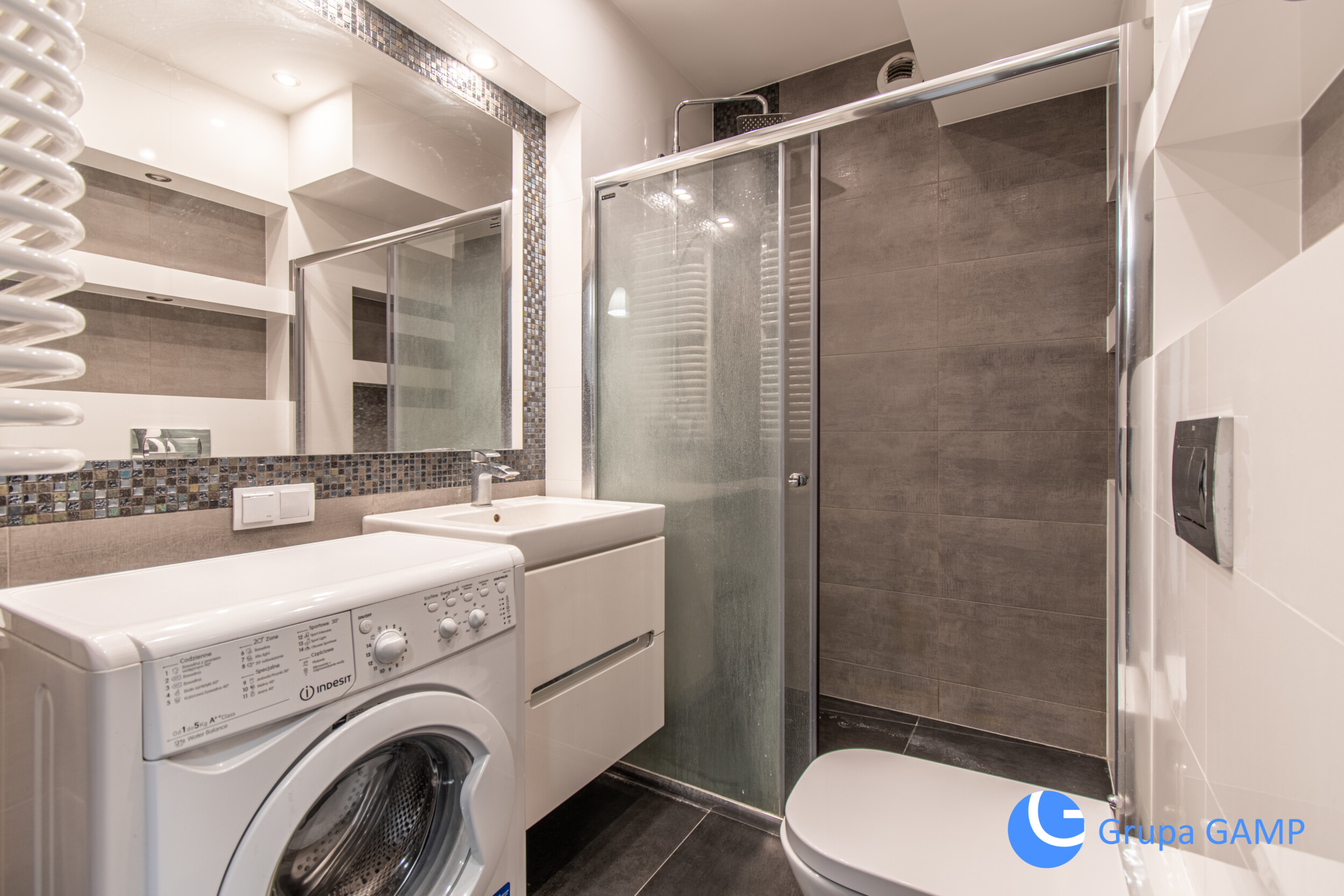 – łazienka: prysznic, umywalka, WC, pralka, lustro grzejnik drabinkowy, szafka;