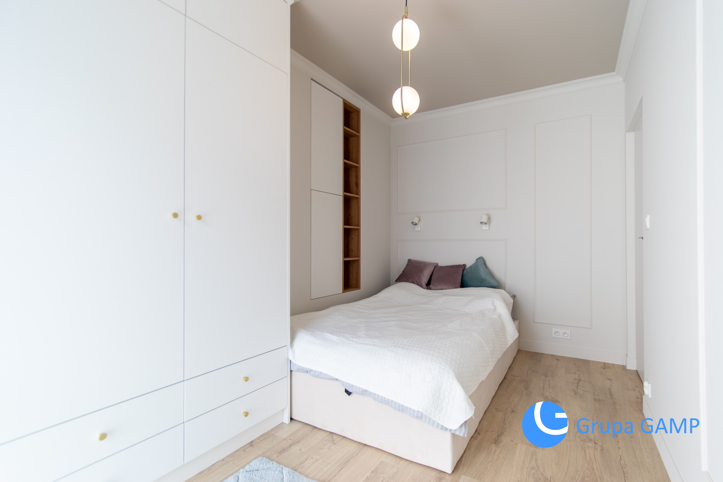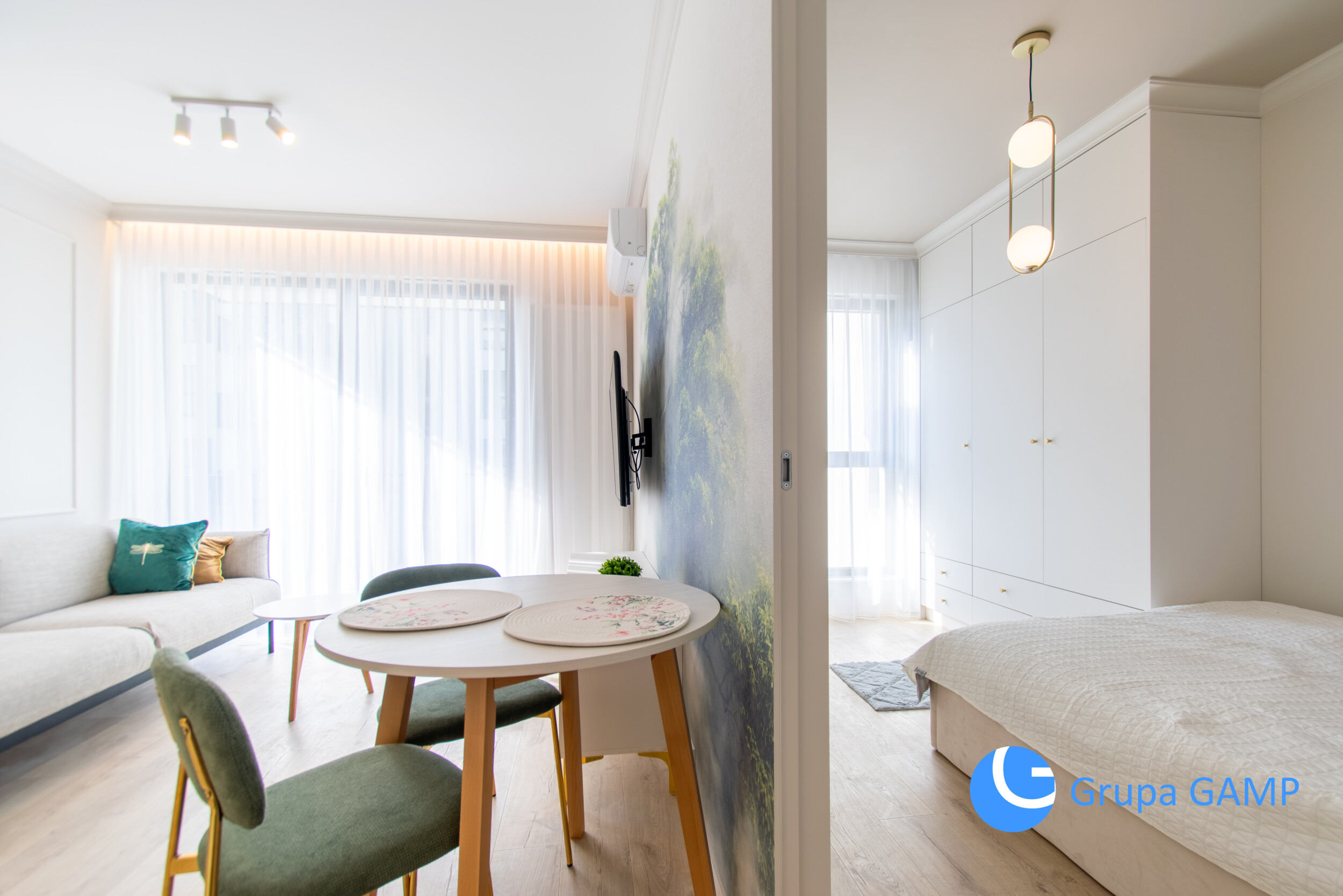 Rozkład pomieszczeń: osobna sypialnia + łazienka (prysznic, kabina prysznicowa, toaleta, pralka, umywalka) + salon z aneksem kuchennym z pełnym wyposażeniem + przedpokój (szafa).
